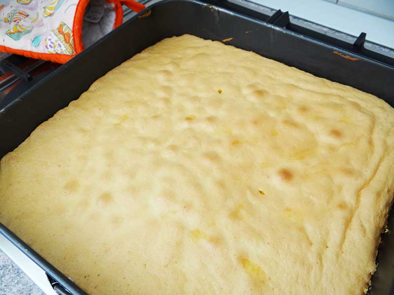 5. Turnăm aluatul în formă și îl dăm la cuptor pentru 13 minute. Facem testul cu scobitoarea care trebuie să iasă curată. Lăsăm la răcit 2-3 ore.