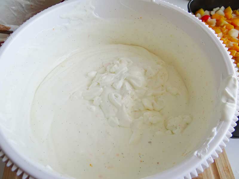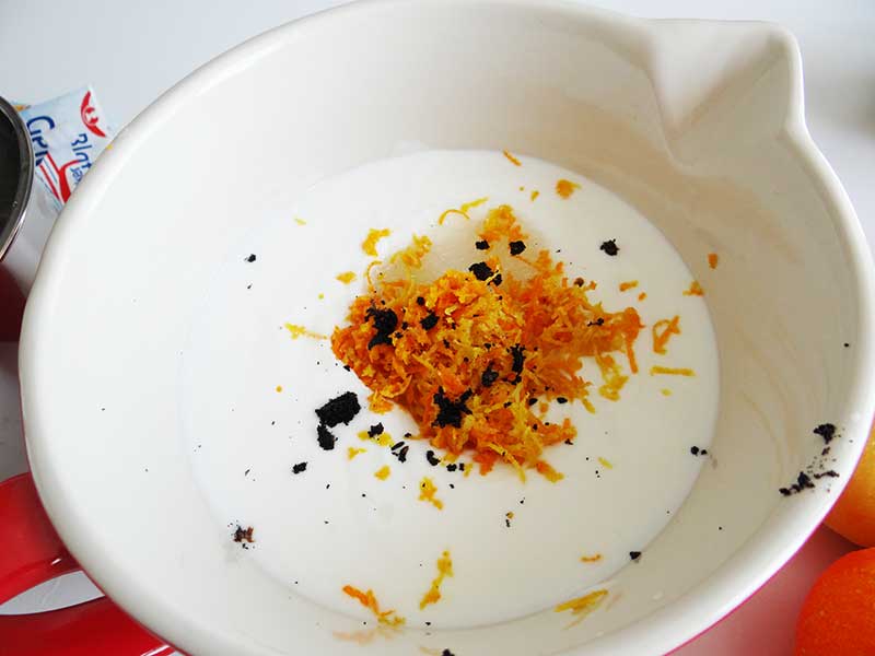 7. Acum trebuie să ne ocupăm de crema de iaurt. Punem foile de gelatină la hidratat în apă rece. Combinăm iaurtul cu zahărul, semințele de la păstaia de vanilie și coaja de lămâie și portocală.