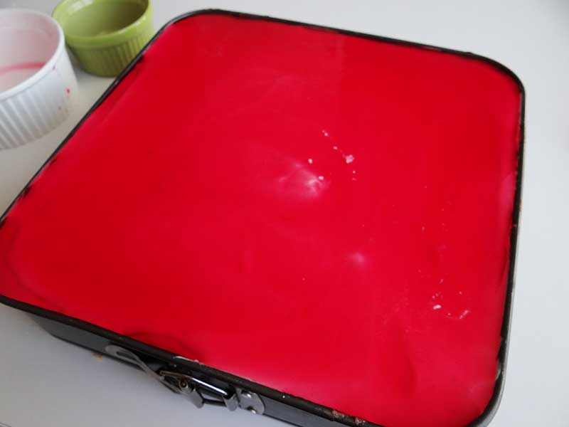 9. Dăm prăjitura la frigider și facem stratul de jeleu. Combinăm conținutul celor două plicuri cu zahărul. Turnăm puțină apă cât să dizolvăm amestecul după care îl punem pe foc împreună cu restul de apă și compotul. Ținem amestecul pe foc un minut după care îl turnăm deasupra prăjiturii.