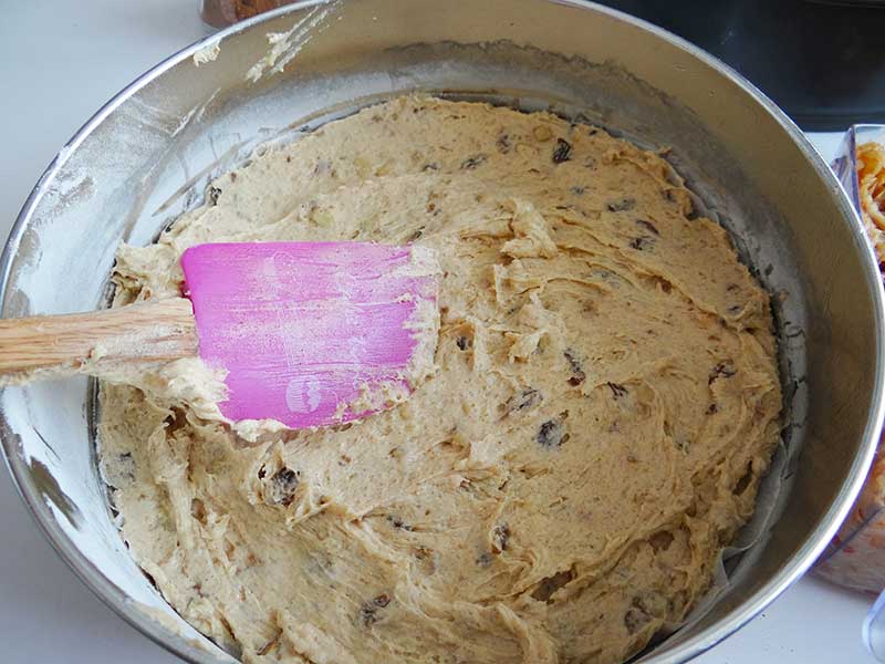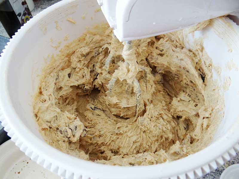 3. Mixăm untul și zahărul până când amestecul devine cremos și se deschide la culoare. După care punem restul ingredientelor: toate ouăle o dată, făina, 1 linguriță de scorțișoară, praful de copt, nucile și stafidele. Mixăm până când totul este omogenizat perfect.