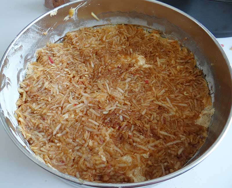 4. Punem jumătate din aluat în formă. Nivelăm cu o spatulă din silicon, după care adăugăm merele, răzuite în prealabil pe răzătoarea mare și amestecate cu o linguriță de scorțișoară.