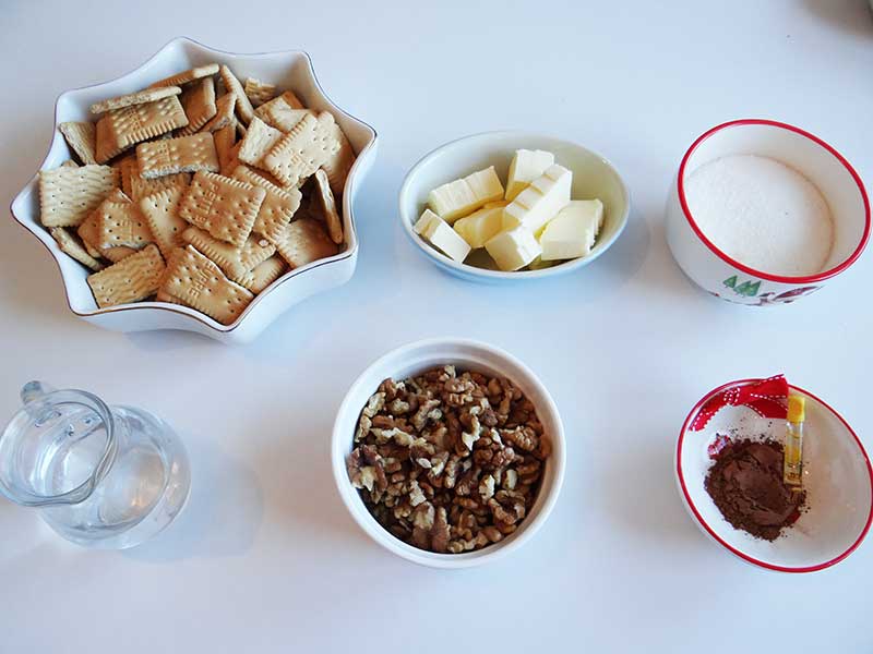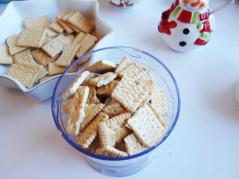 1. Măcinăm nuca si biscuiții, fin, cu ajutorul unui robot de bucătărie.