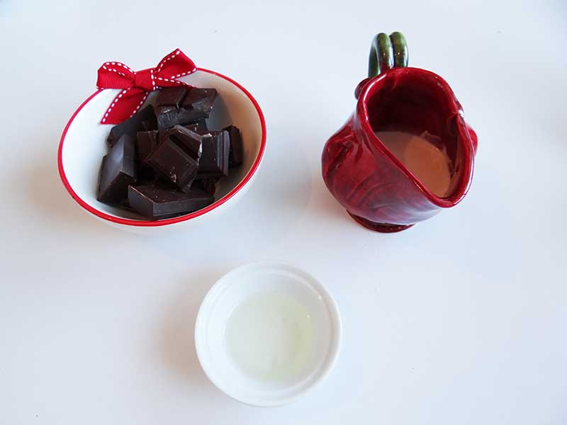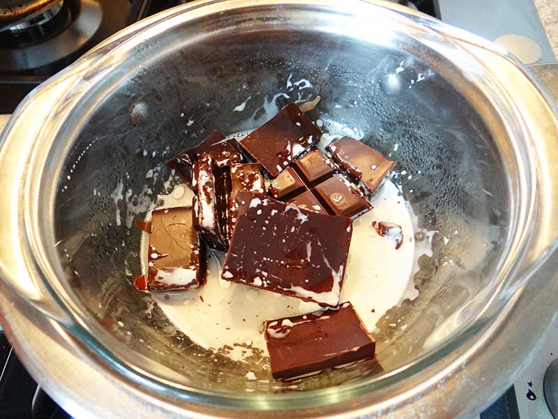8. Pregătim glazura. Punem ciocolata, uleiul și smântâna pentru frișcă pe baie de apă. Amestecăm până când ciocolata se topeste complet.