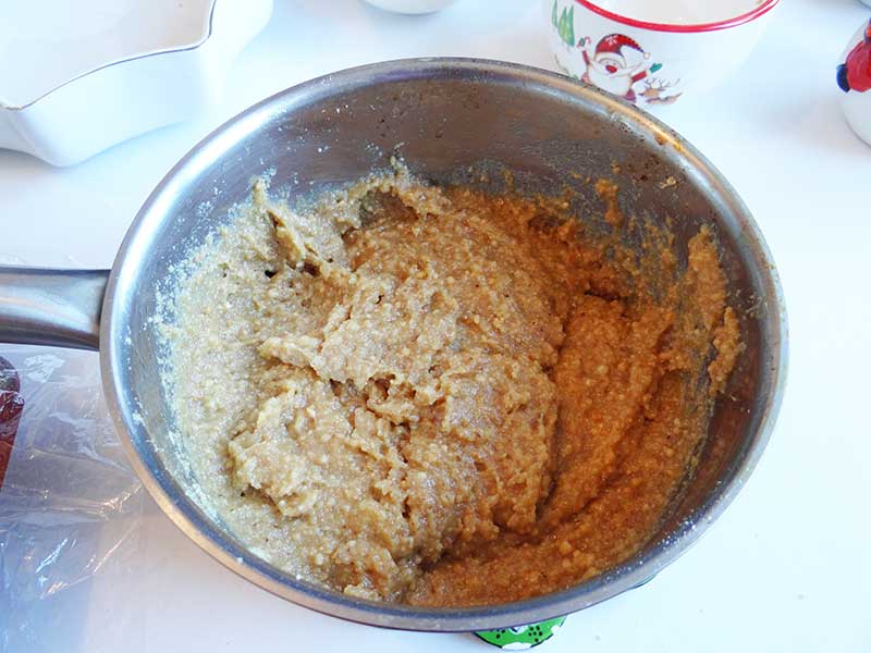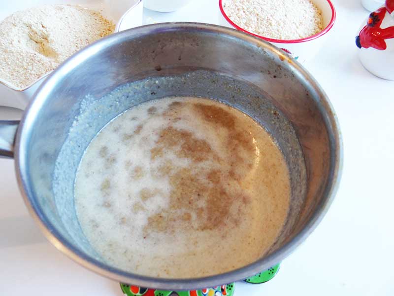 4. Luăm oala de pe foc și apoi adăugăm biscuiții. Amestecăm totul bine.