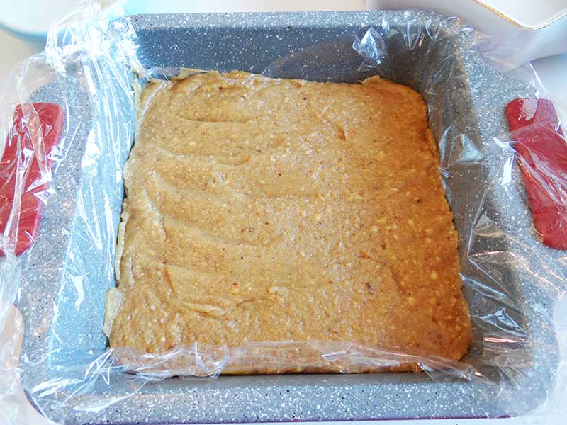 Împăturim prăjitura în folie, o așezăm pe o suprafață dreaptă și o introducem la frigider.
