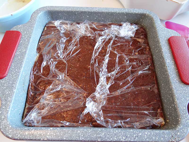 Deasupra acestui strat punem compoziția închisă la culoare pe care o nivelăm cu ajutorul unei spatule. Acoperim prăjitura cu folie de plastic și o dăm la frigider pentru 60 de minute.