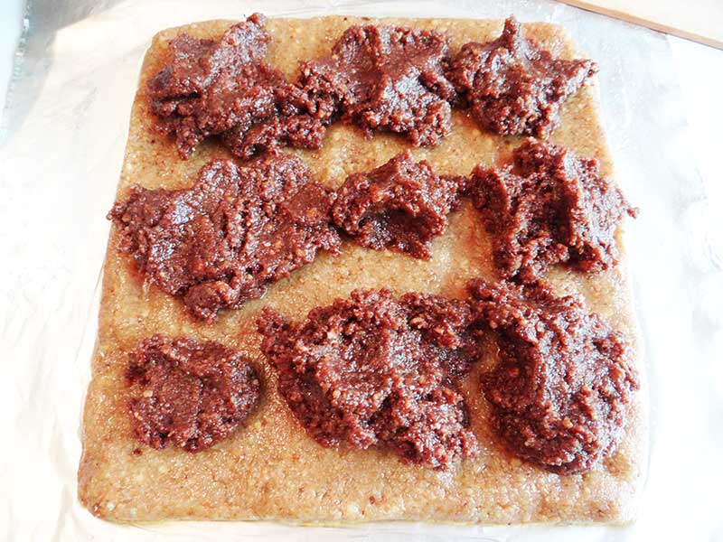 Deasupra acestui strat așezați bucătețele mici din compoziți închisă la culoare pe care apoi le presați ușor cu degetele și încercați să le uniformizați.
