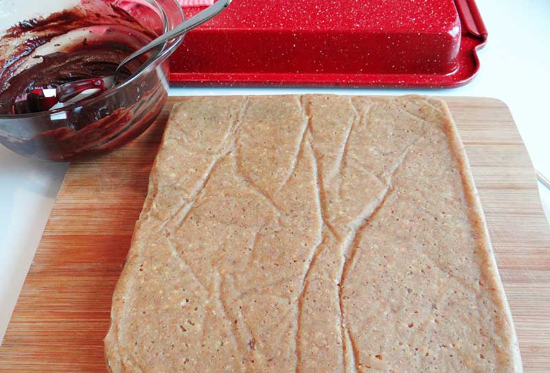 Prima este mai simplă și o puteți realiza dacă aveți o tavă cu dimensiunea de 20/21cm. Așezăm în tavă o bucată de folie de plastic apoi deasupra ei întindem primul strat de compoziție deschisă la culare.