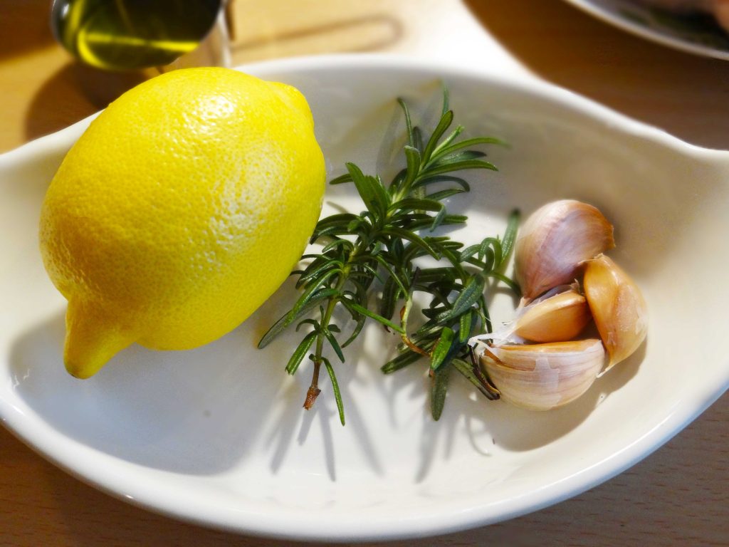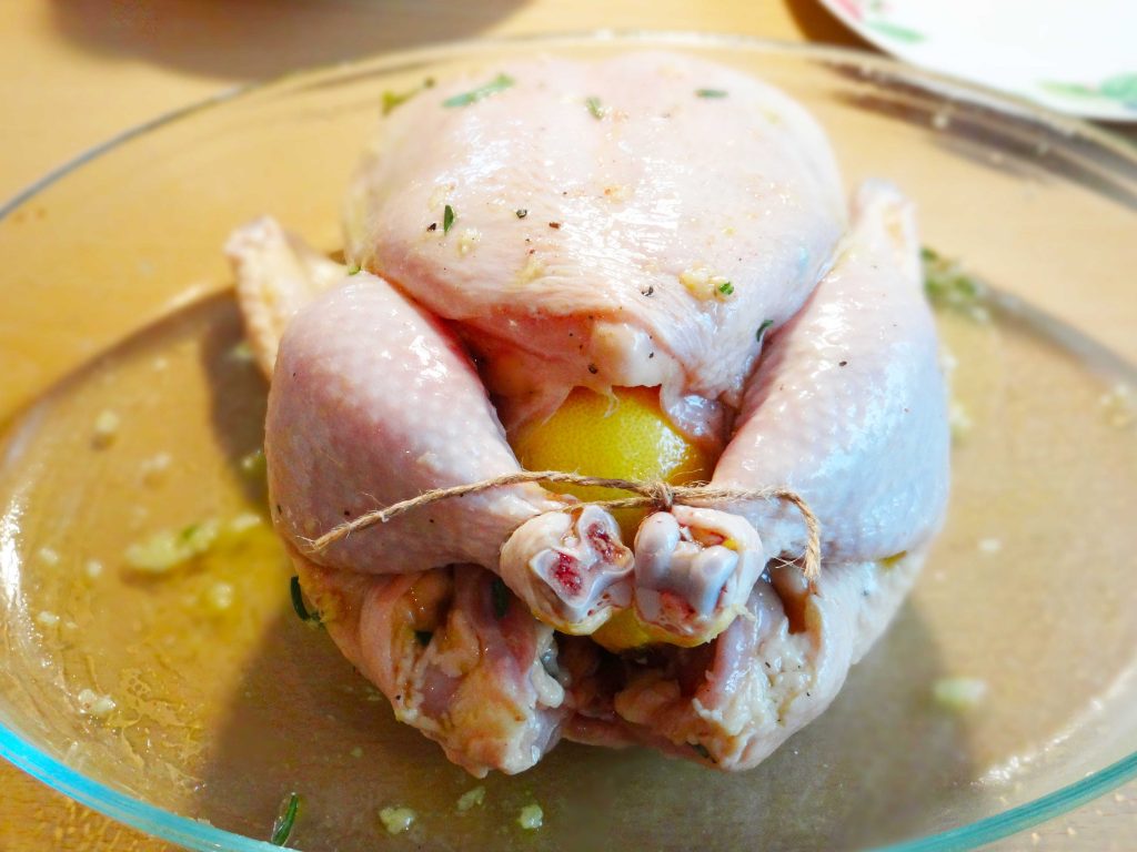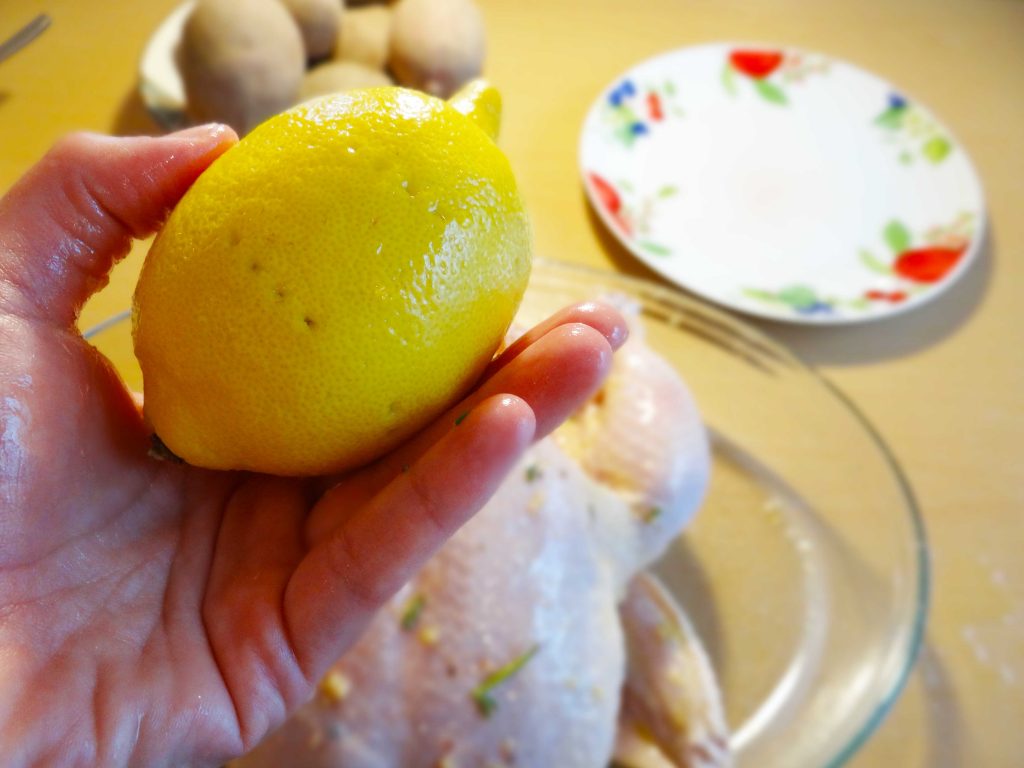 4. Cu ajutorul unei furculițe facem mici găurele în lămie și apoi o așezăm în interiorul puiului.