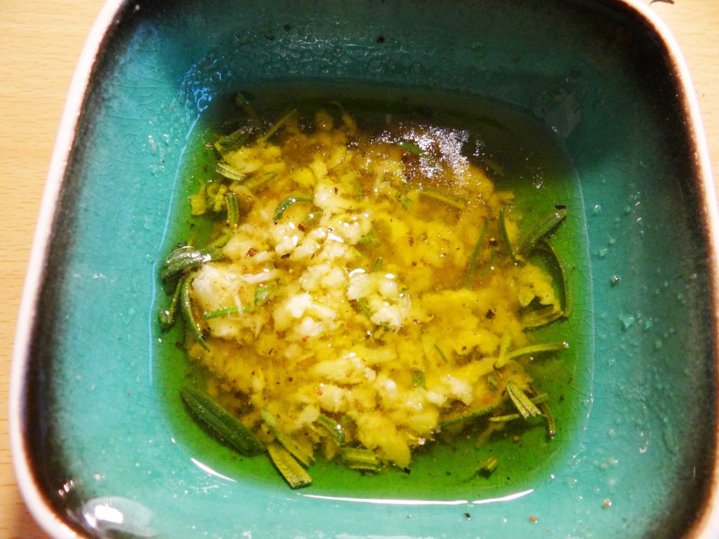 2. Într-un castron combinăm uleiul cu sarea, piperul, rozmarinul tocat fin, usturoiul mărunțit.