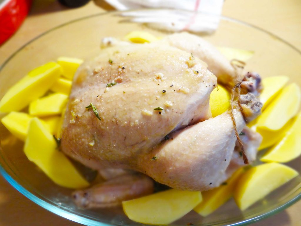 6. Dăm puiul la cuptor pentru 15 minute după care îl scoatem și așezăm cartofii în jurul lui(cartofii îi tăiem în 4). Tot acum punem și un sfert de cană cu apă.