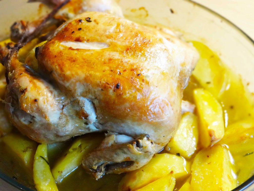 7. Introducem puiul în cuptor pentru aproximativ o oră. În acest timp eu l-am scos de două ori pentru a-l întoarce atât pe el cât și pe cartofi.