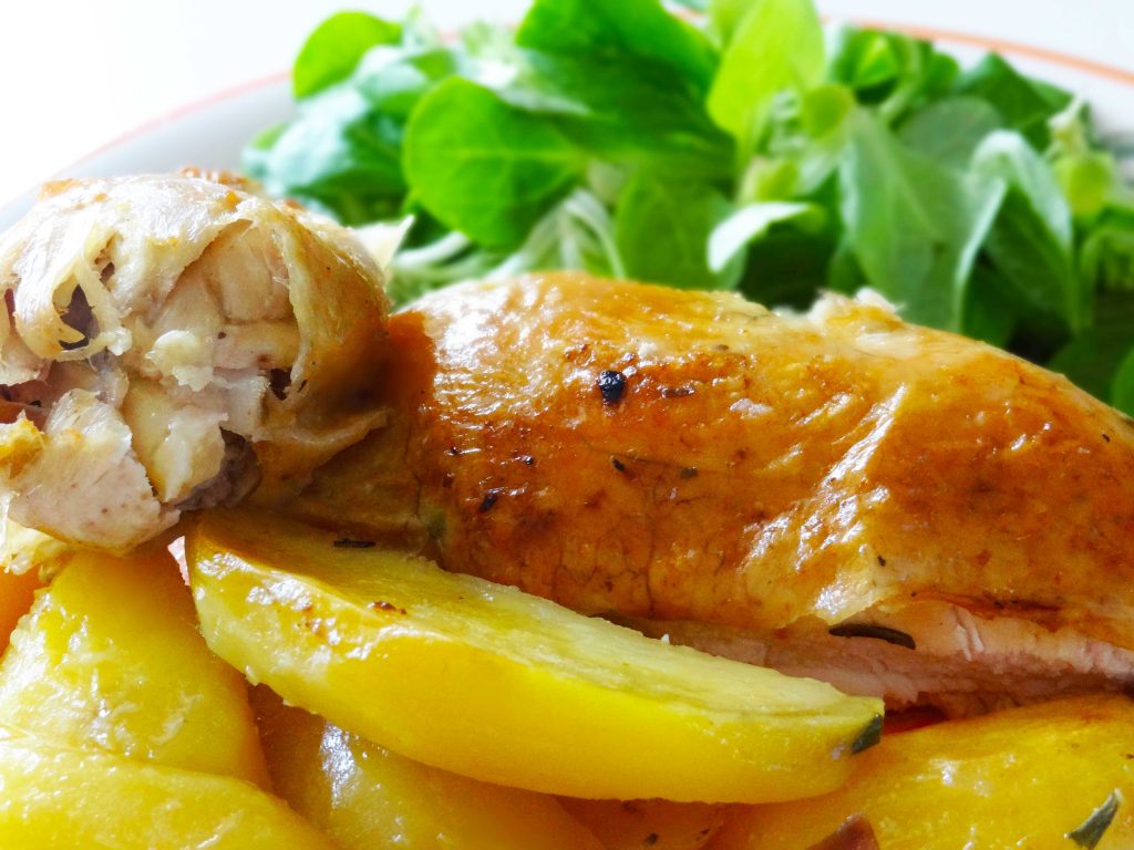 Așa arată la final puiul, fraged și aromat. Cartofii sunt foarte gustoși și ei. Am servit totul alături de o salată de valeriană.