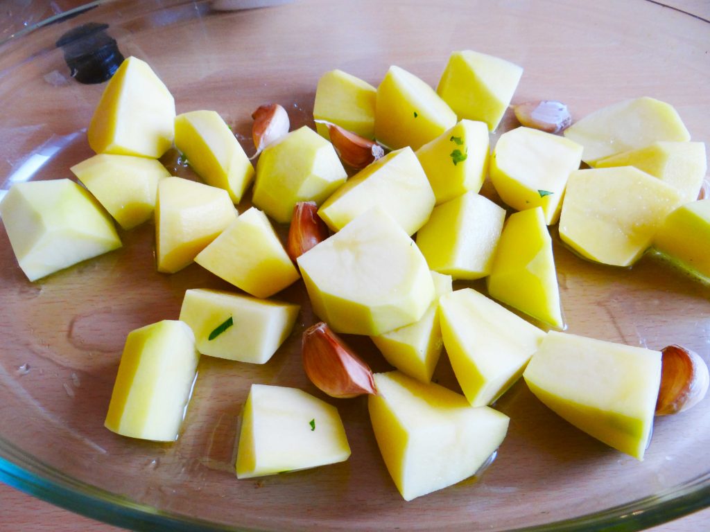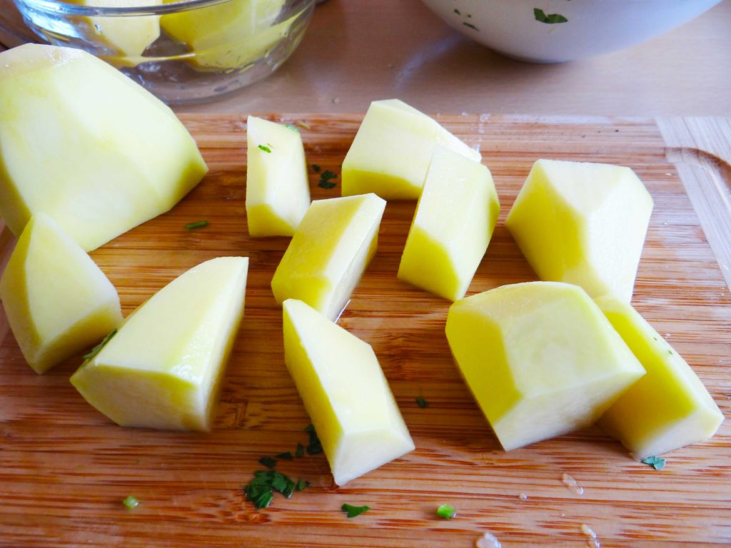 3. În următorul pas curățăm cartofii și îi tăiem în bucăți mari.