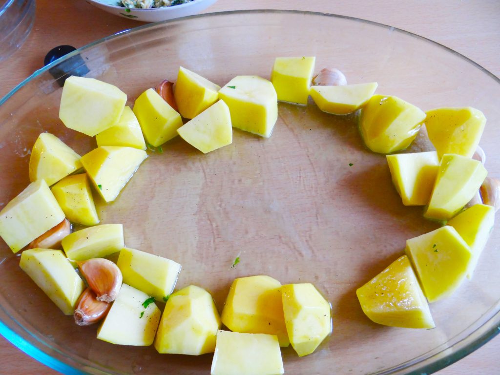 4. Punem puțin ulei în tava în care vom coace puiul. Apoi adăugăm cartofii, o căpățână de usturoi necurățat de coajă(pentru a evita arderea lui). Adăugăm puțină sare și piper și cu ajutorul mâinii amestecăm totul bine astfel încât fiecare bucată de cartof să fie acoperită cu ulei.