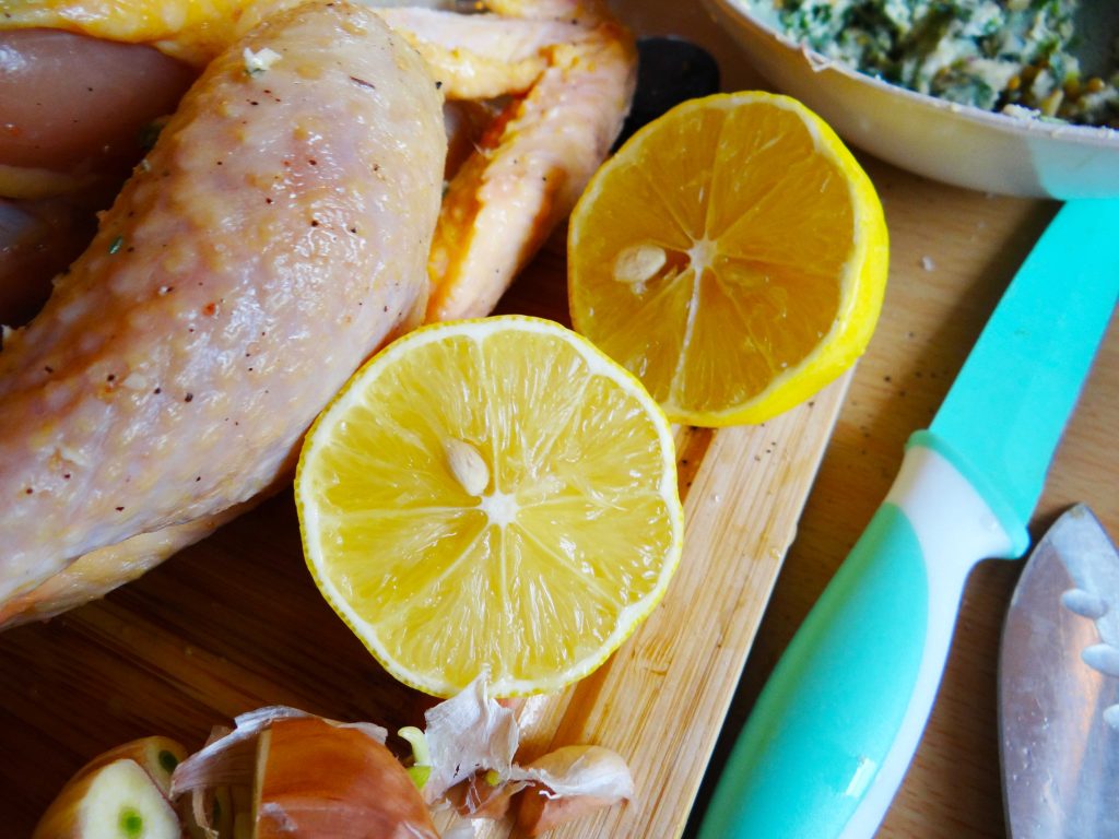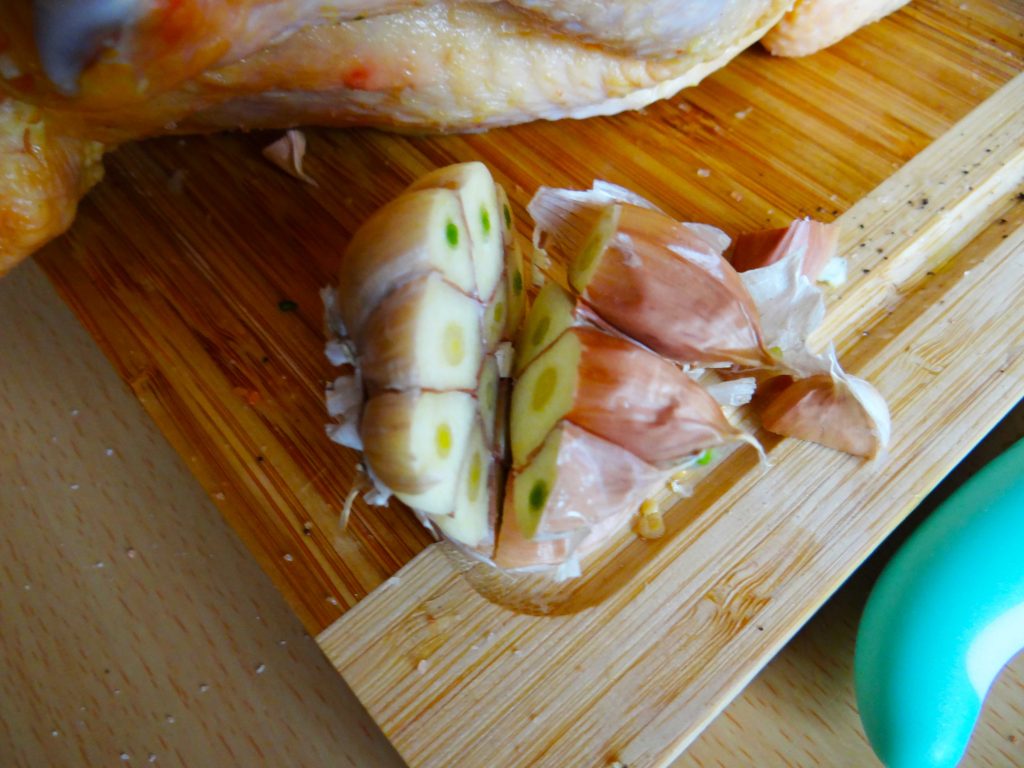 În cavitatea internă introducem lămâia tăiată pe jumate și o căpățână de usturoi tăiată tot pe jumate.