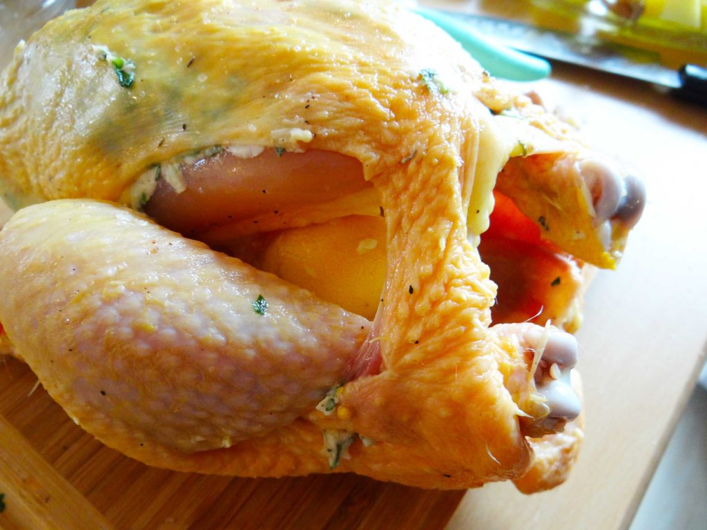 Cu ajutorul degetelor facem un buzunăraș între piele și piept(cu grijă să nu rupeți pielea). În acest buzunăraș vom introduce untul aromatizat(3/4 din el).