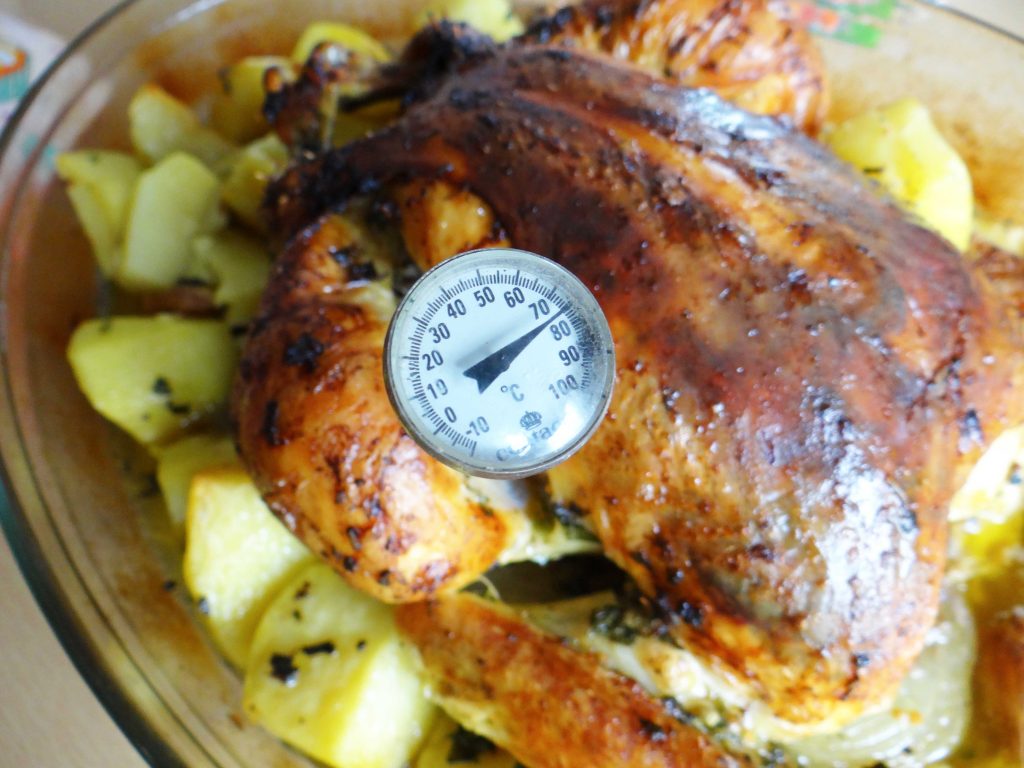 Pentru a vă asigura că puiul este copt puteți să verificați temperatura internă a acestuia cu ajutorul unui termometru pentru carne. Când temperatura internă este de 77 grade înseamnă că este făcut. Dacă nu aveți termometru vă ajutați de un cuțit subțire, desprindeți cu ajutorul lui puțină carne de pe os iar daca lichidul care iese nu conține sânge înseamnă ca este făcut.(cel mai bine verificați în profunzimea pulpei superioare).