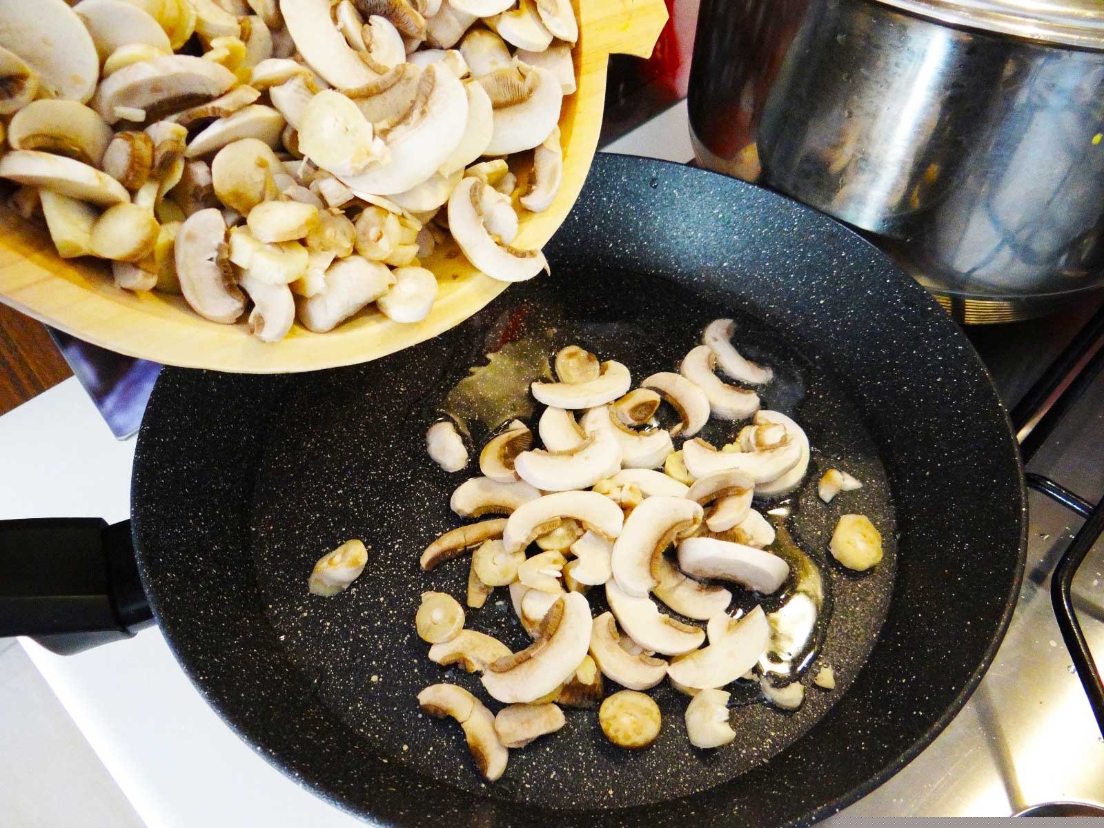 2. Intr-o tigaie antiaderenta punem  uleiul la incins dupa care adaugam ciupercile pe care le lasam cam 10 minute.