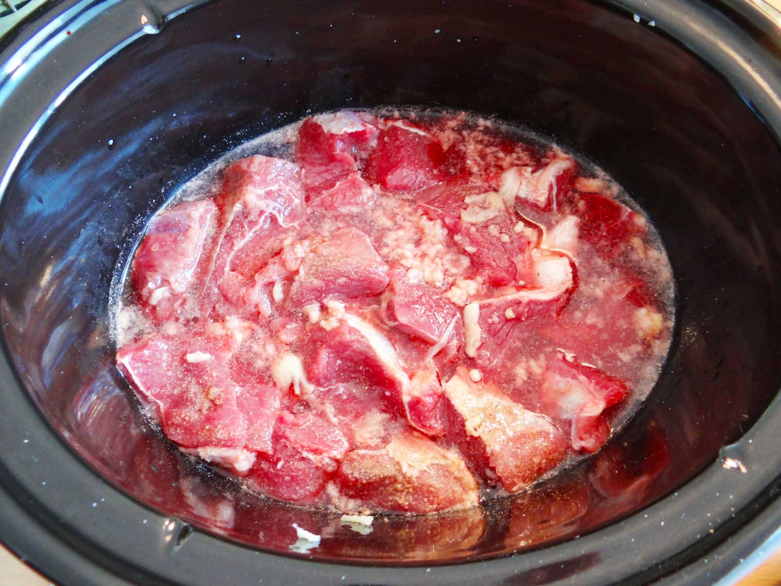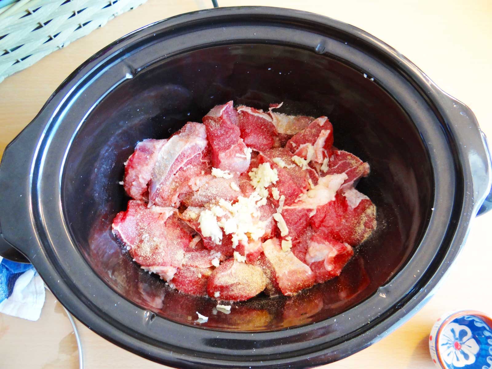 3. Punem carnea in Crock pot. Peste ea adaugam usturoiul maruntit, sare si piper. *puteti inlocui usturoiul maruntit cu usturoi granule.