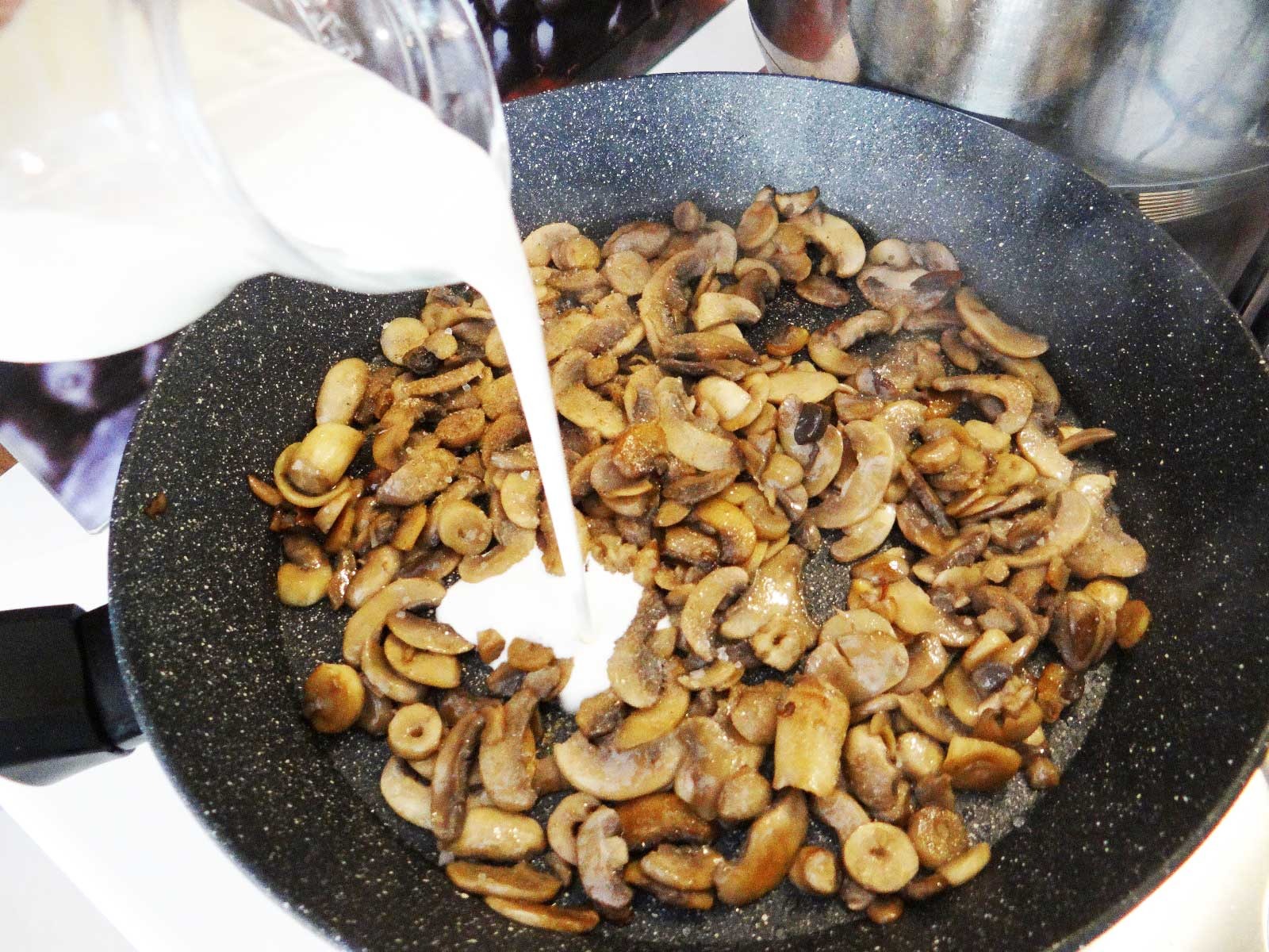 3. Cand ciupercile  au devenit usor maronii reducem focul si adaugam smantana lichida pe care o lasam sa fiarba  5-8 minute, nu mai mult. Tot acum adaugam sare si piper.