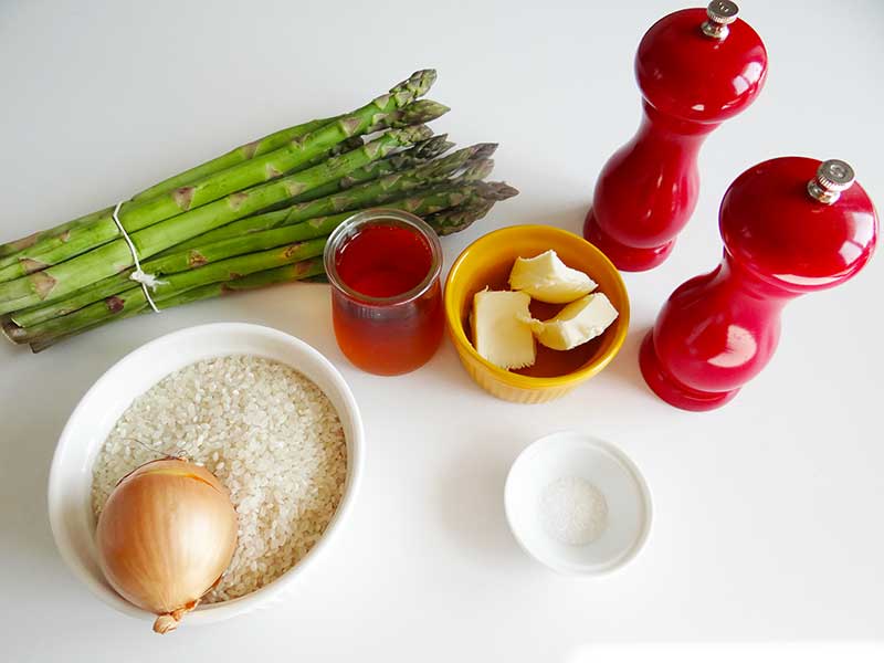 6. Într-o oală încăpătoare și cu fund dublu călim ceapa. Când aceasta devine translucidă, adăugăm orezul(spălat bine în prealabil). Amestecăm astfel încât fiecare bob de orez să fie acoperit de unt. Adăugăm vinul și fierbem totul până când acesta este absorbit complet, moment în care începem să adăugăm din apa în care a fiert sparanghelul. Apa o adăugăm treptat, pe măsură ce este absorbită de orez. În tot acest timp trebuie să amestecăm. După un timp de circa 15 minute adăugăm piureul și vârfurile de sparanghel împreună cu untul. Asezonăm cu sare și piper. Oprim focul și acoperim oala cu un capac și lăsăm risotto-ul să se odhinească 2-3 minute înainte de a fi consumat.