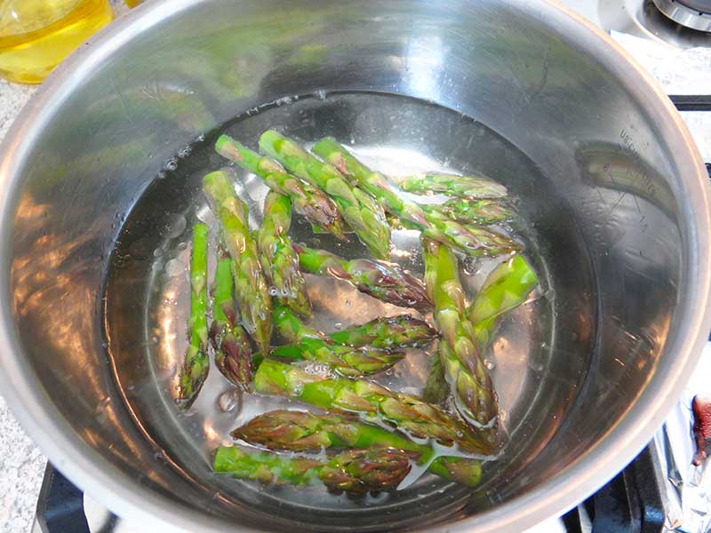 4. Când apa începe să fiarbă introducem vărfurile de sparanghel pe care le fierbem în jur de 3 minute. Când vârfurile au fiert, le scoatem cu o spumieră și le punem într-un castron cu apă rece, facem acest lucru pentru a le păstra culoarea verde aprins.