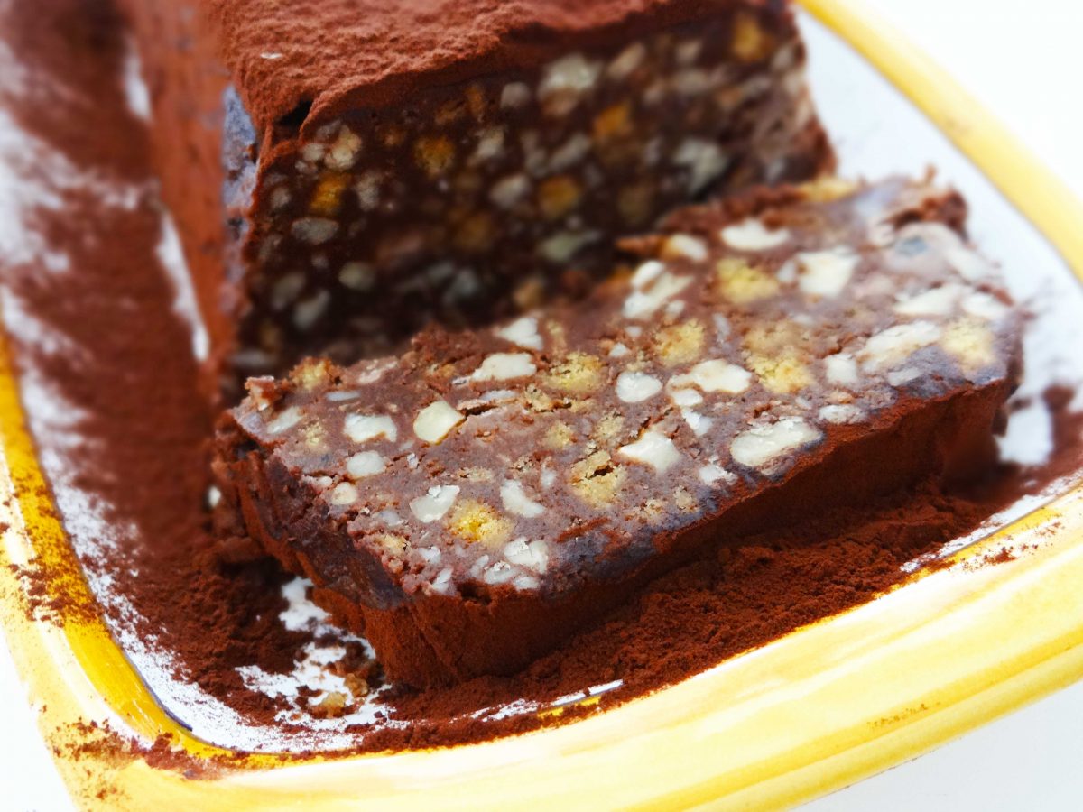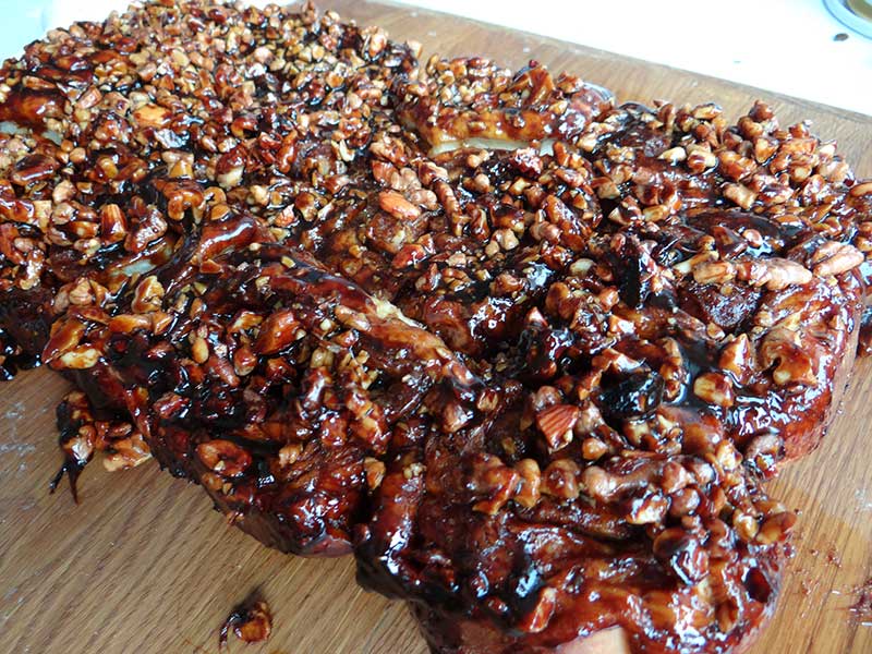 Turnăm acest amestec într-o formă de copt cu dimensiunile de 23x33cm și tapetată cu hârtie de copt. Deasupra presărăm nuca tăiată în bucăți mari și apoi așezăm bucățile de aluat.
