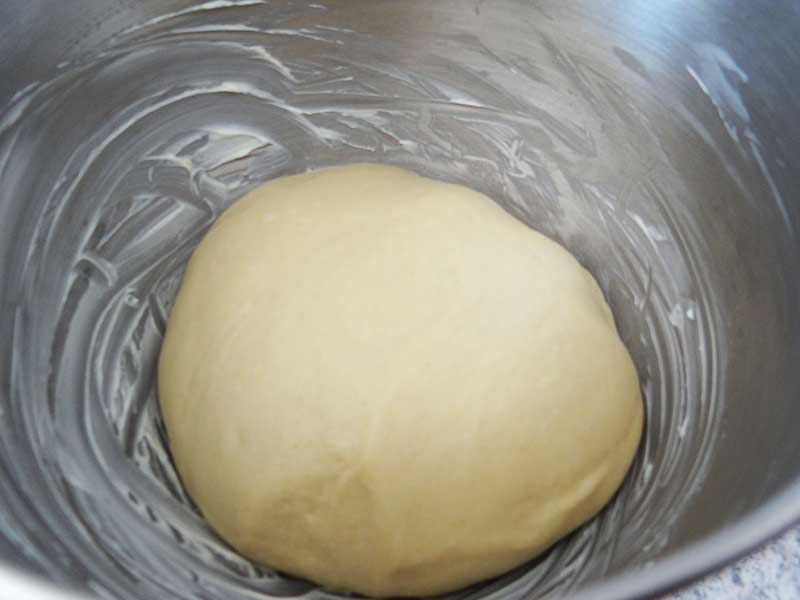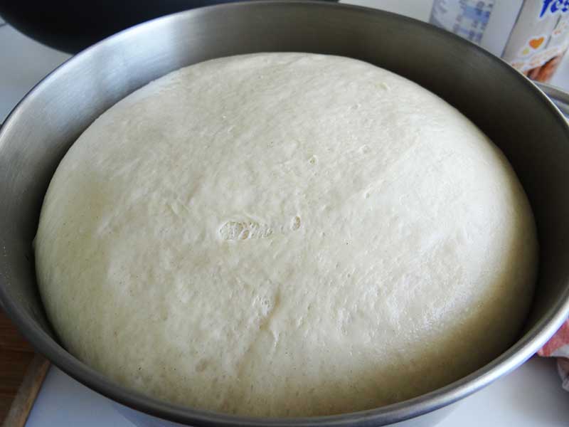 Îi dăm aluatului o formă rotundă și îl așezăm într-un vas înalt pe care îl ungem în prealabil cu unt. Acoperim vasul cu o folie de plastic și îl așezăm într-un loc călduț.