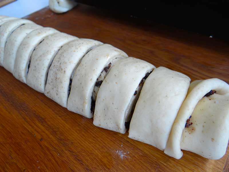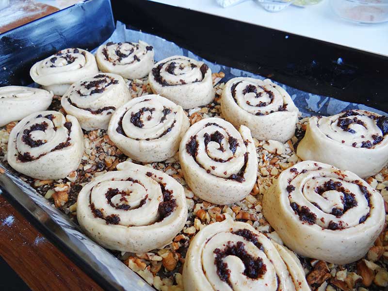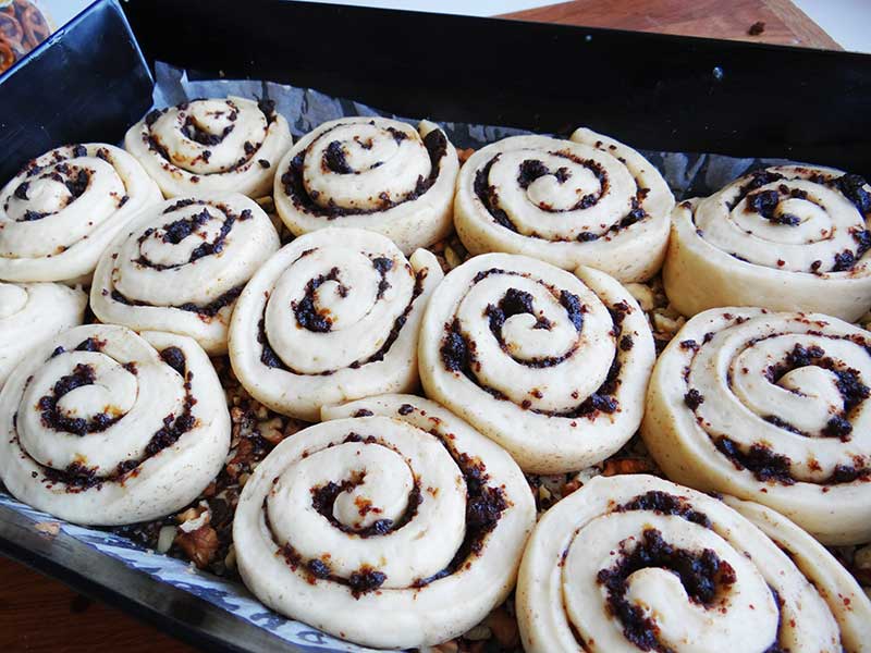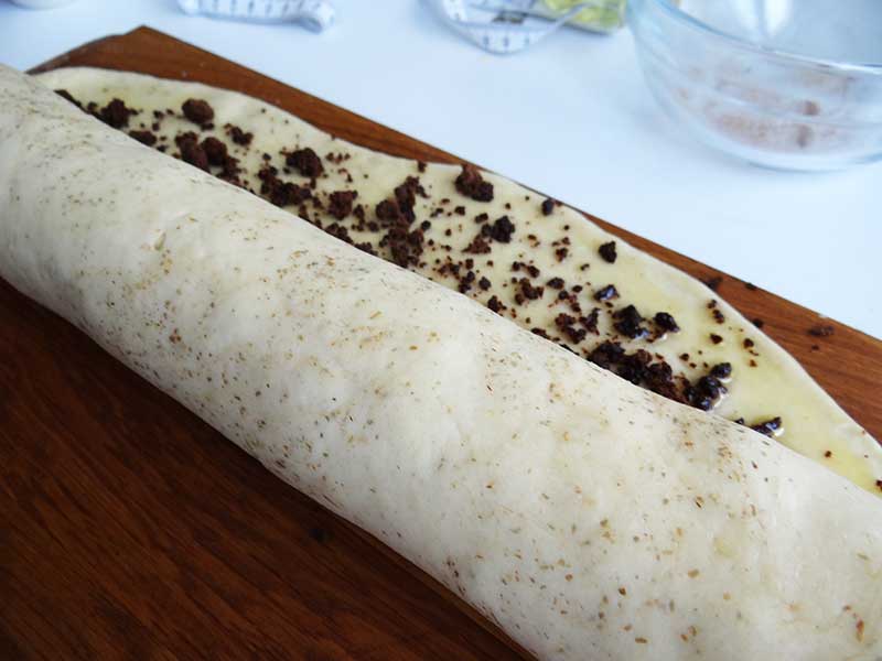 4. După ce a crescut aluatul nostru îl așezăm pe masa de lucru(ușor înfăinată) și îl întindem cu un sucitor. Trebuie să obținem o foaie cu dimensiunea de 25x35cm. Ungem foaia cu unt și presărăm umplutura pe toată suprafața ei. Rulăm foia după care o tăiem în bucăți egale(13-14 bucăți).