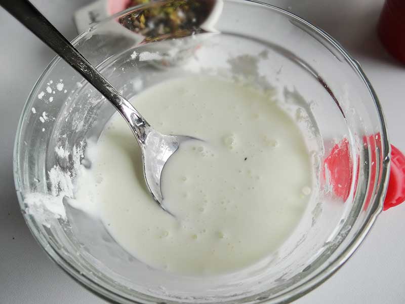 2. Dizolvăm amidonul în 4 liguri de lapte călduț după care îl turnăm peste laptele din oală. Amestecăm încontinuu, 4-5 minute, până când amestecul capătă consistența unei smântâni groase. La final adăugăm zahărul după gust și esența de vanilie.