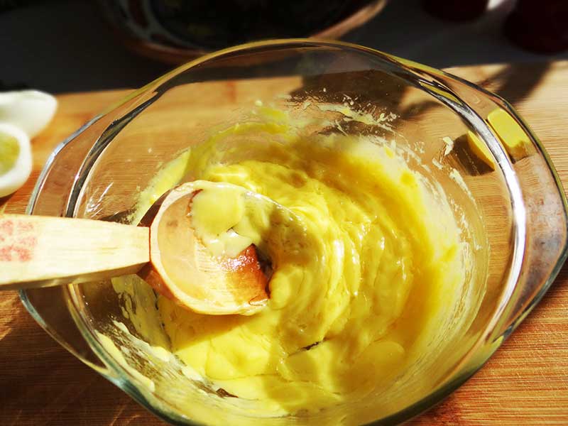 4. Pentru maioneză mixăm gălbenușurile cu uleiul pe care îl adăugăm treptat.