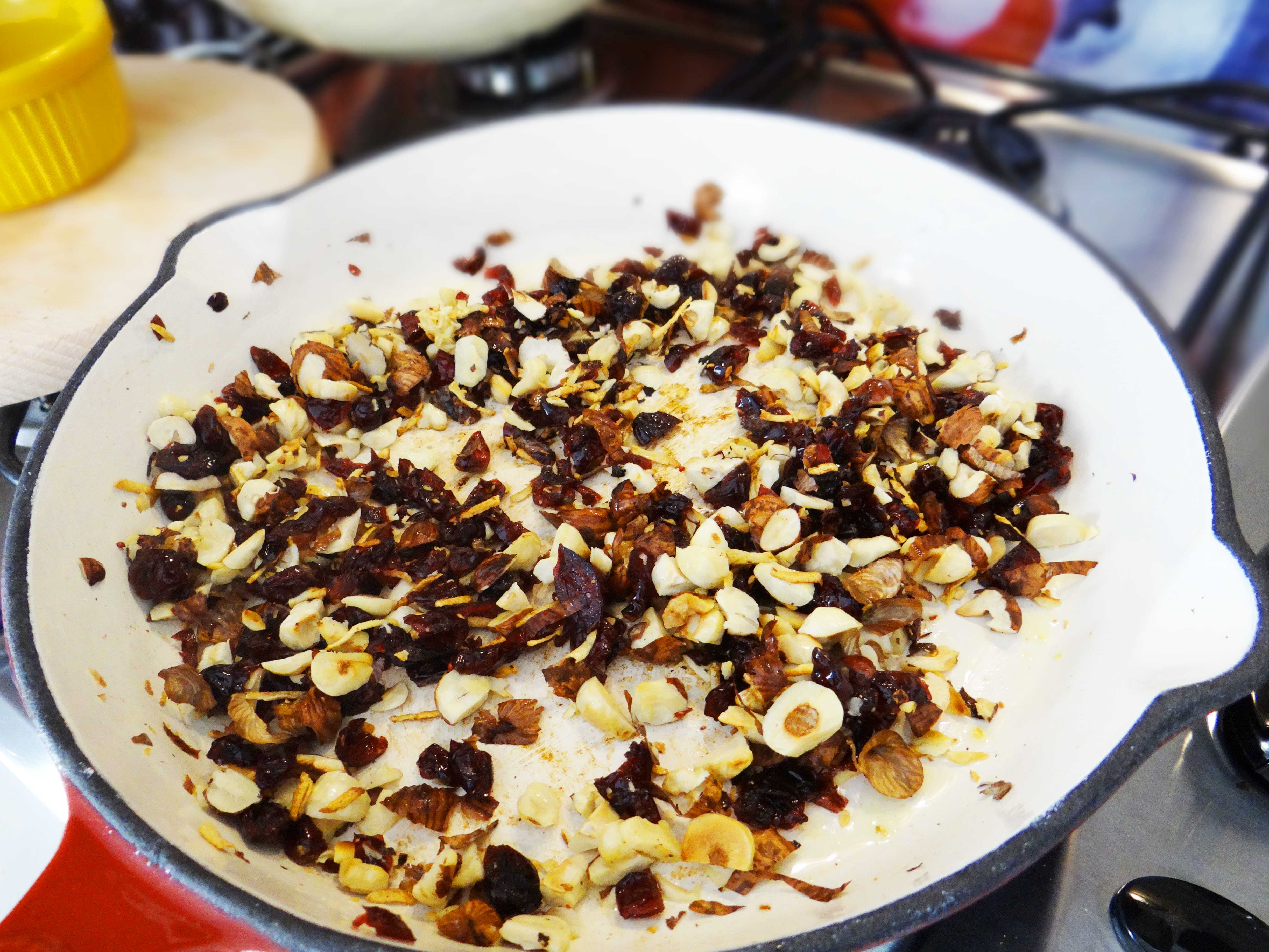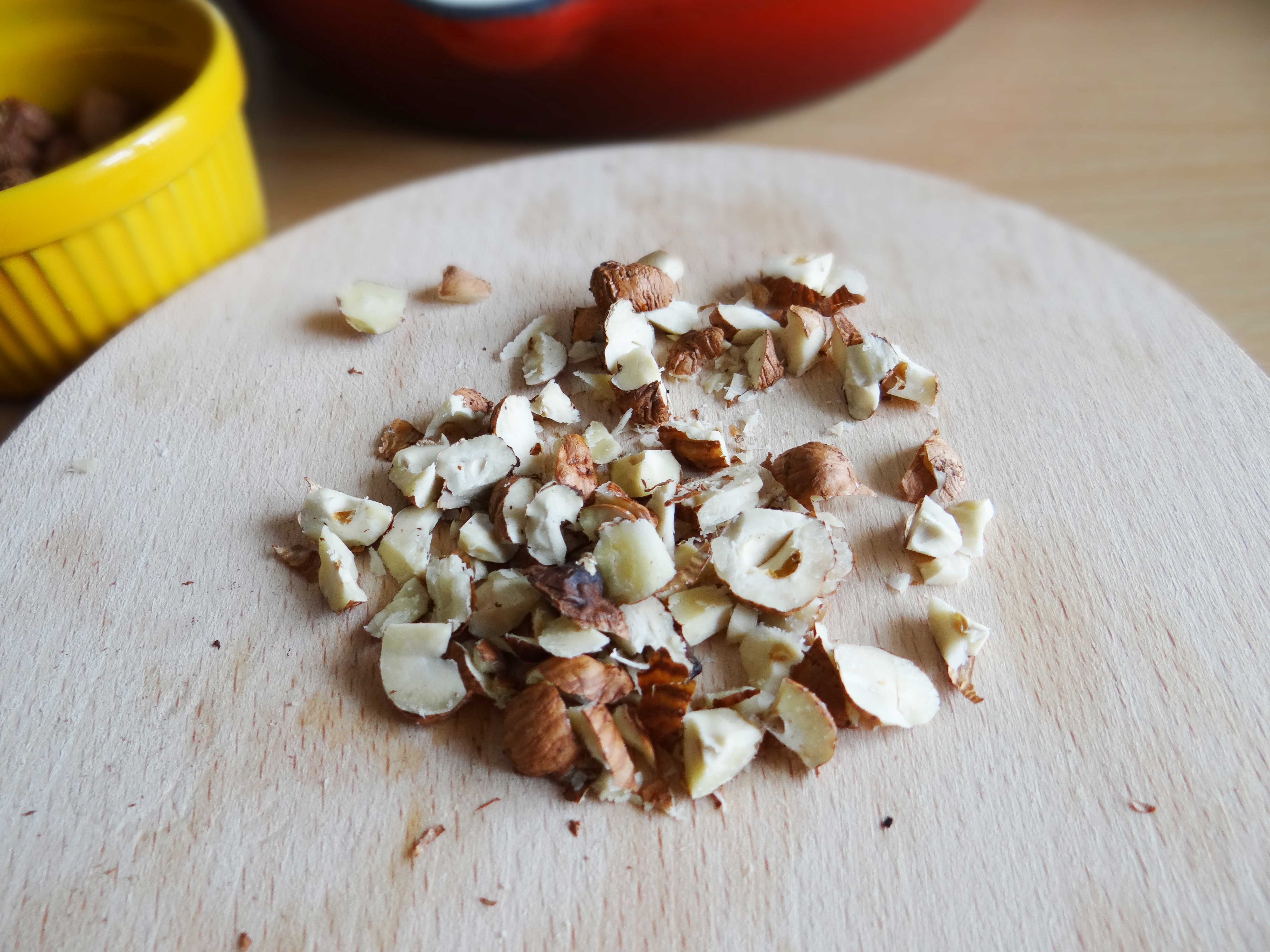 4. Cât timp fierbe varza ne ocupăm de restul ingredientelor. Tăiem alunele în bucăți mici și apoi le prăjim puțin într-o tigaie.
