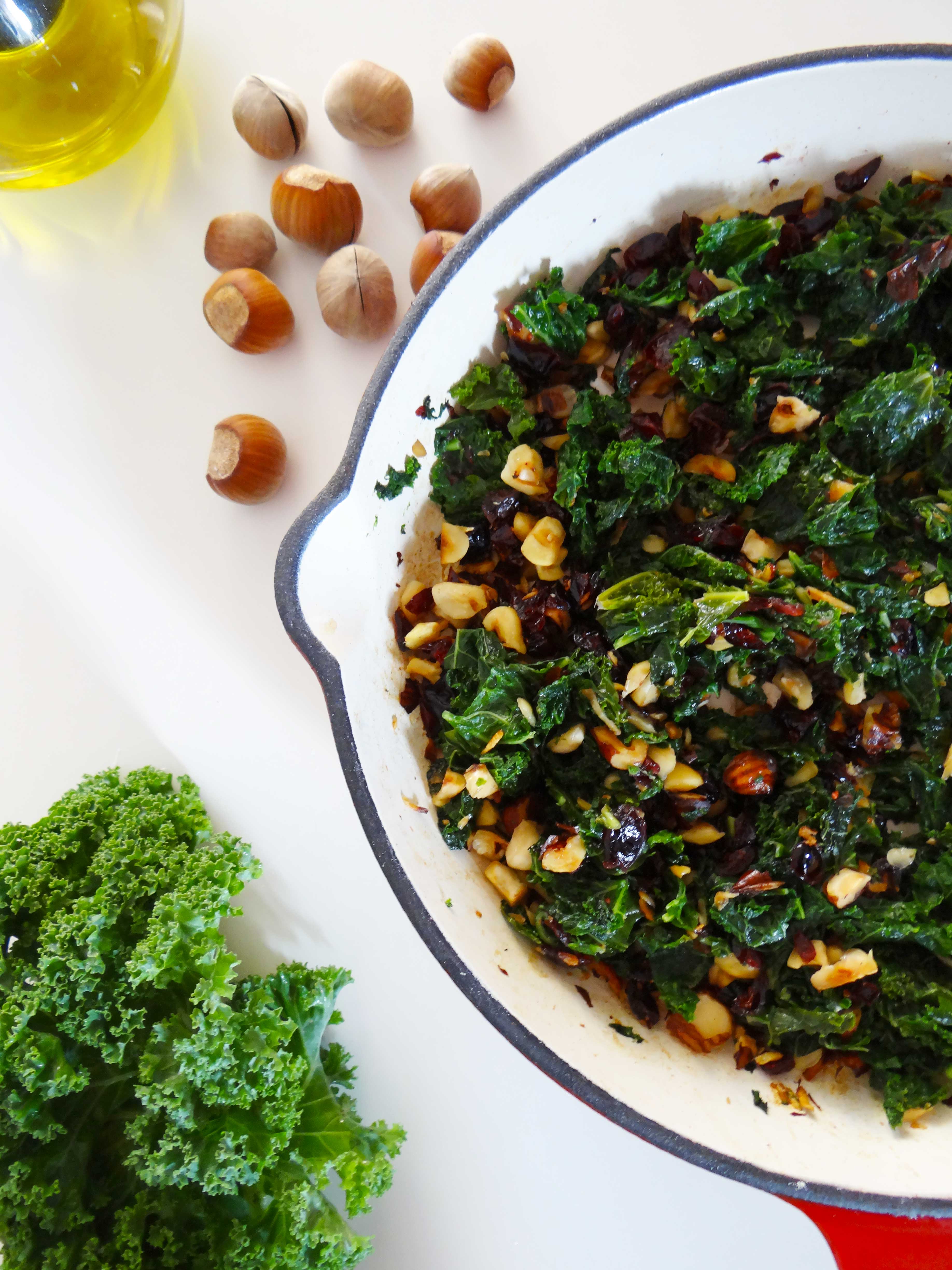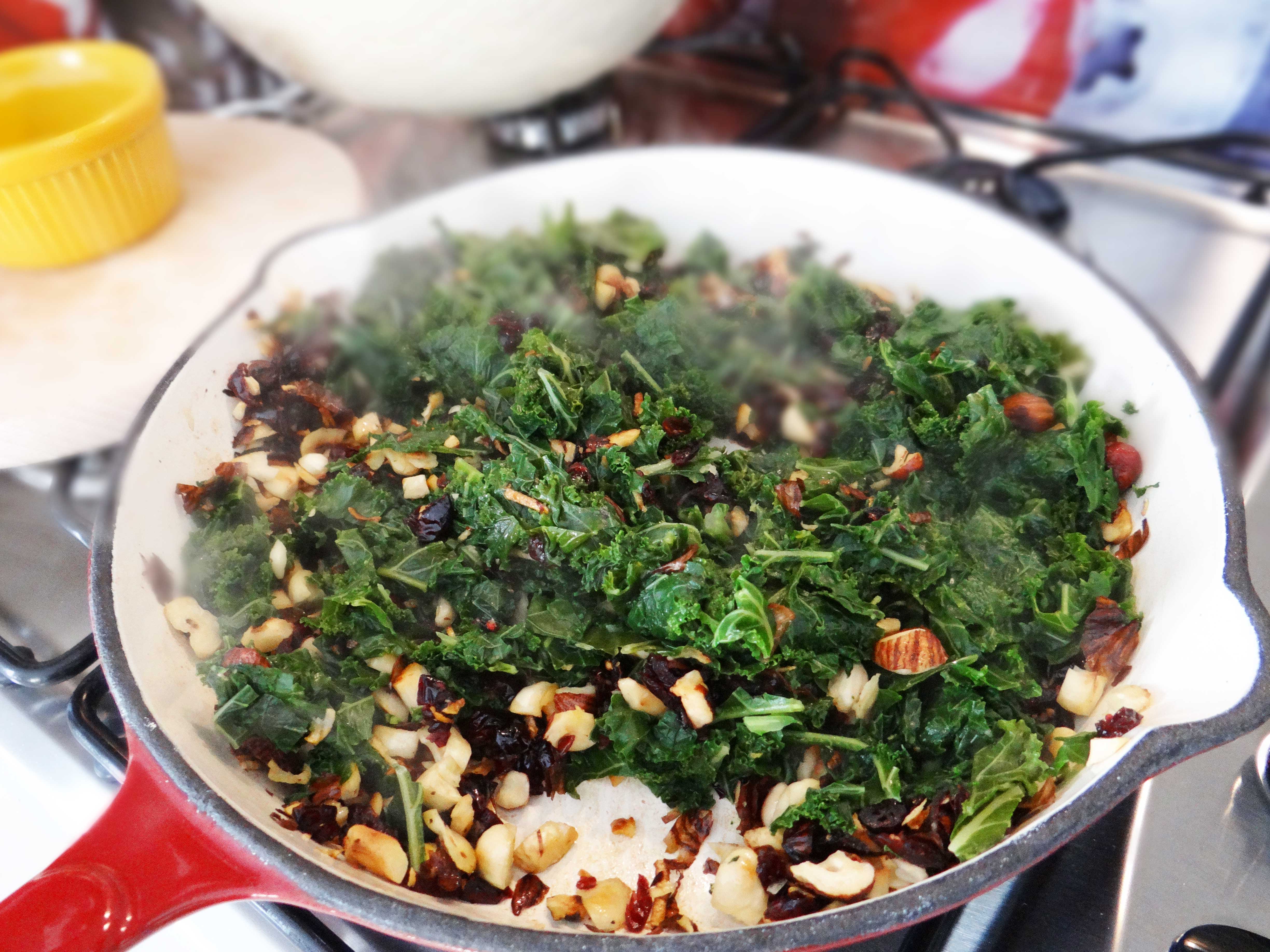 7. Punem uleiul la încins după care adăugăm usturoiul. Îl călim 30 de secunde apoi adăugăm merișoarele, le lăsăm și pe ele 30 de secunde. Adăugăm alunele, le lăsăm 30 de secunde și apoi punem varza kale fiartă și scursă de apă. O călim 3-4 minute, adăugăm sare după gust.