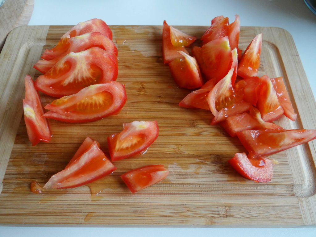 2. Tăiem roșia în bucați mari(roșiile cherry se taie în jumătăți).