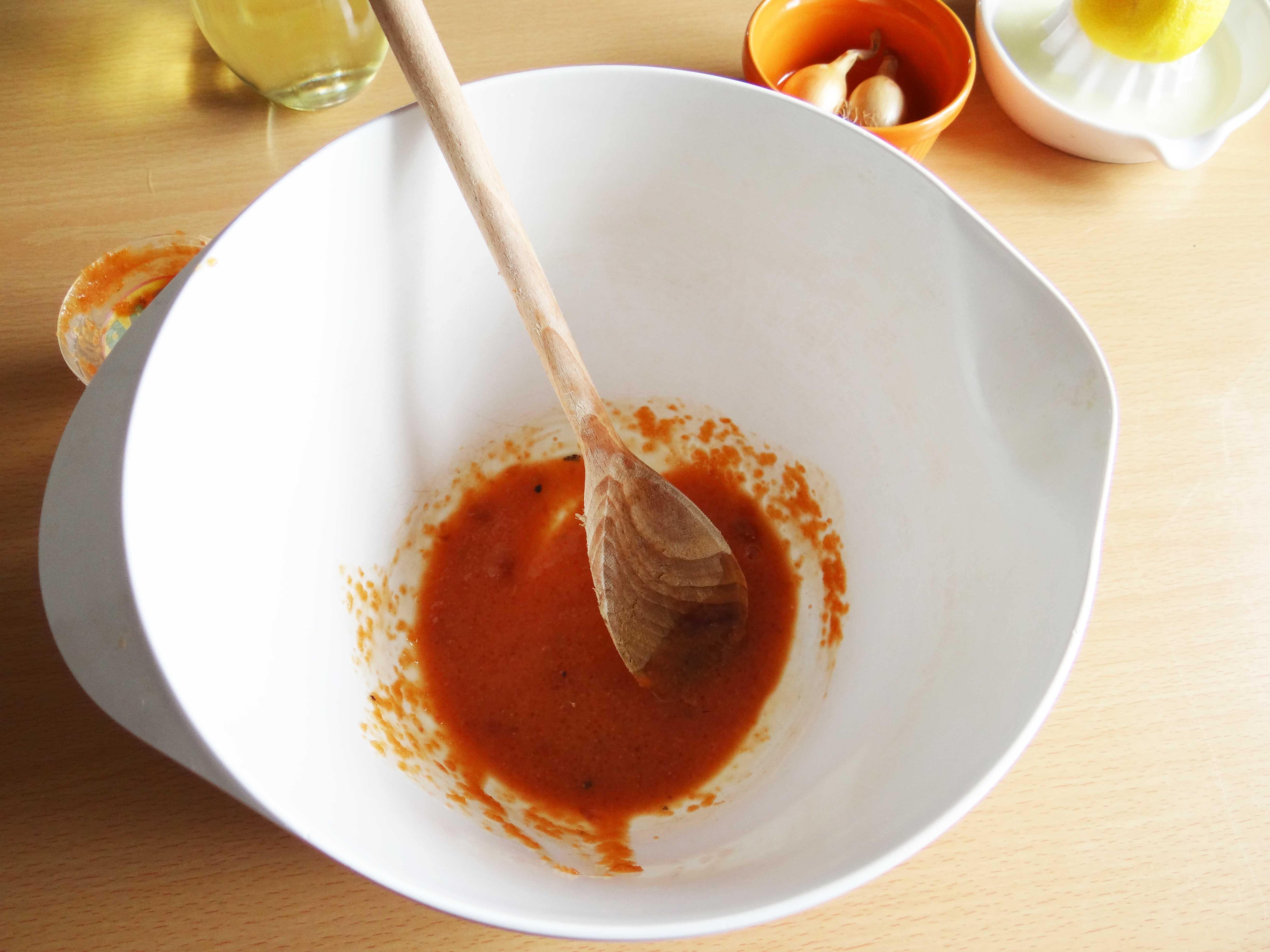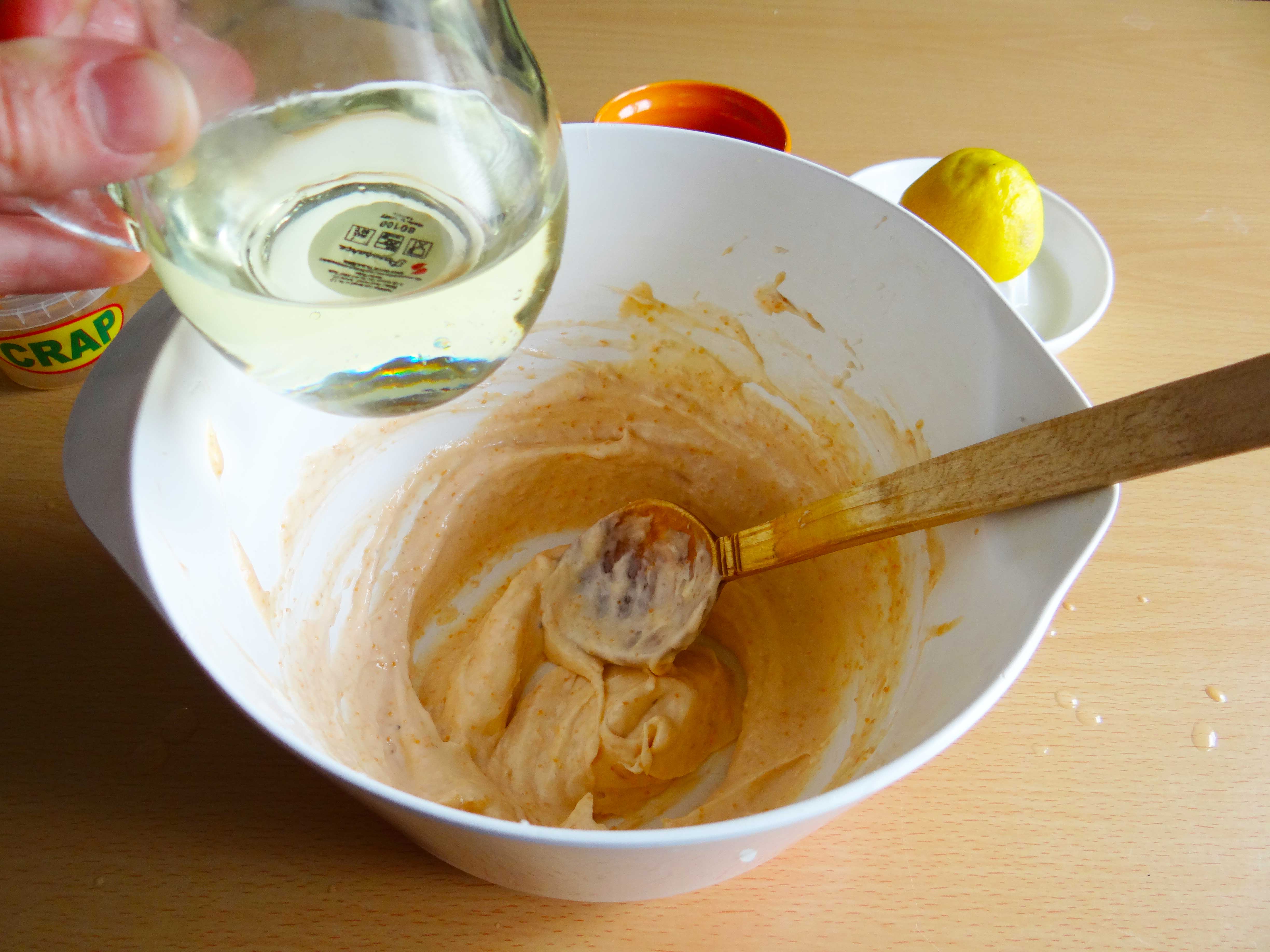 3. Amestecam icrele si adaugam ulei putin cate putin. Secretul este sa amestecam cu viteza mare in acelasi sens si sa nu adaugam mult ulei deodata. Din cand in cand mai adaugam si putin suc de lamaie, care le intaraste si le deschide la culoare.