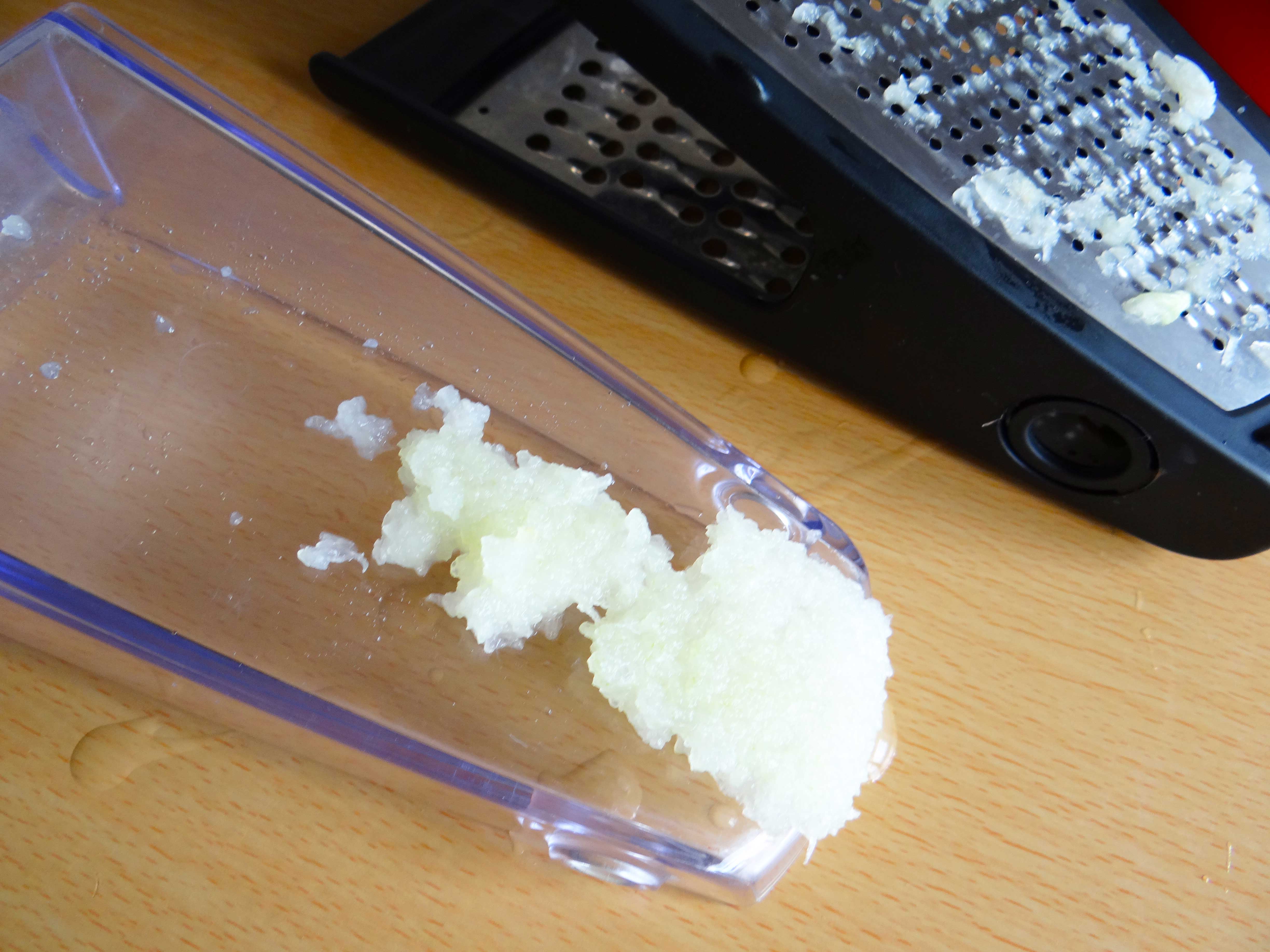 4. Dam ceapa pe razatoarea fina si apoi o punem peste icre. Amestecam bine si salata noastra este gata.