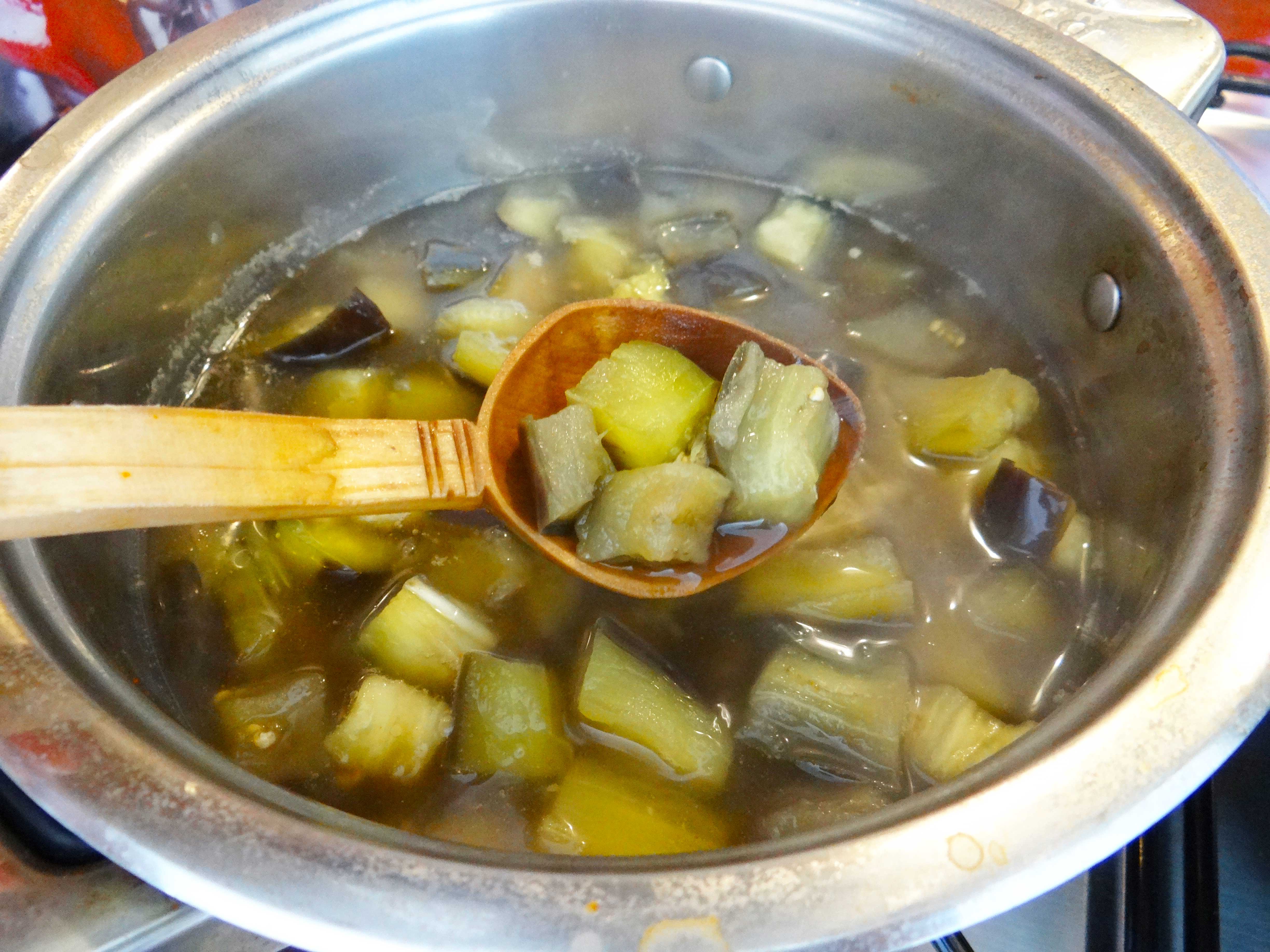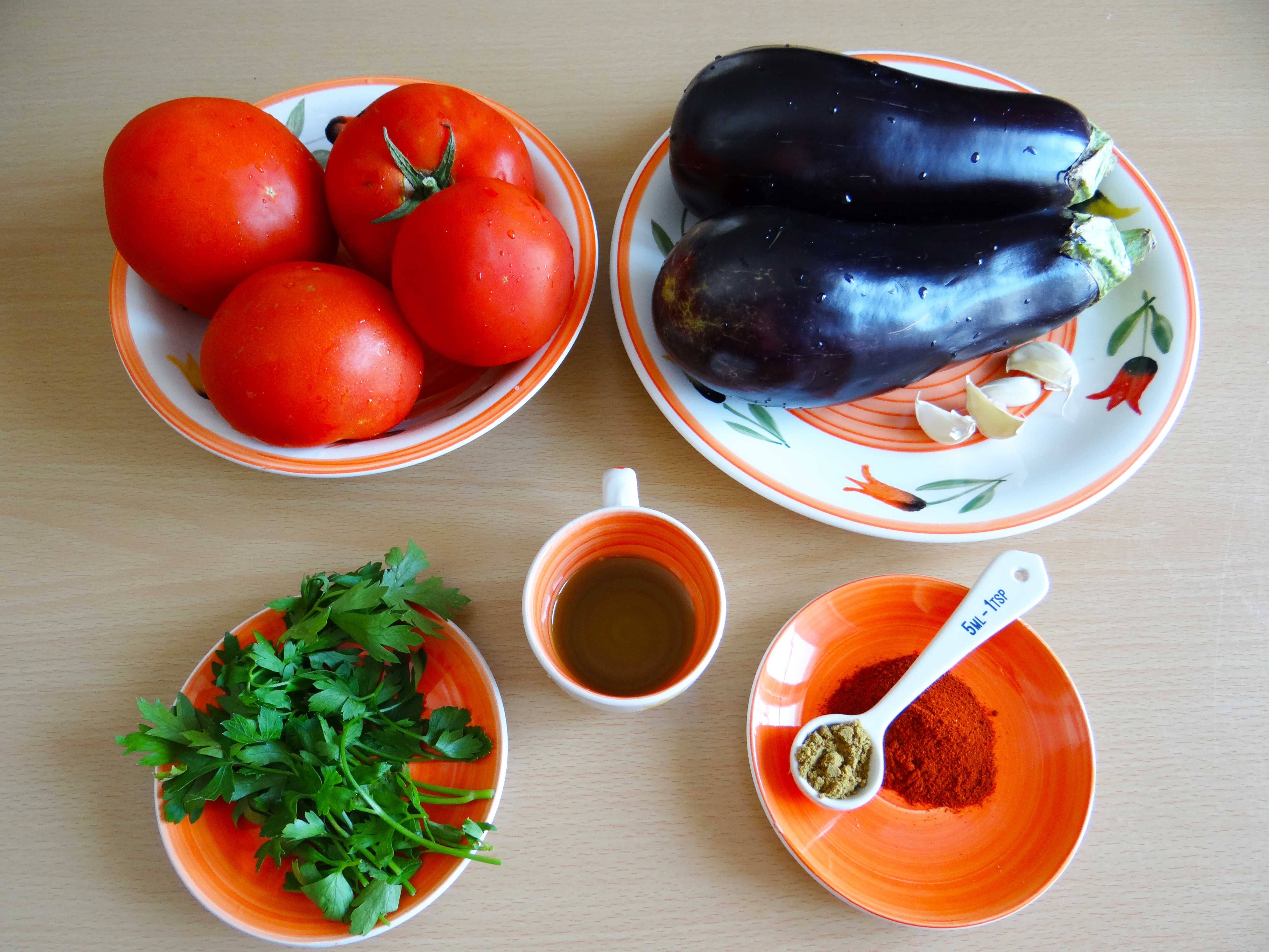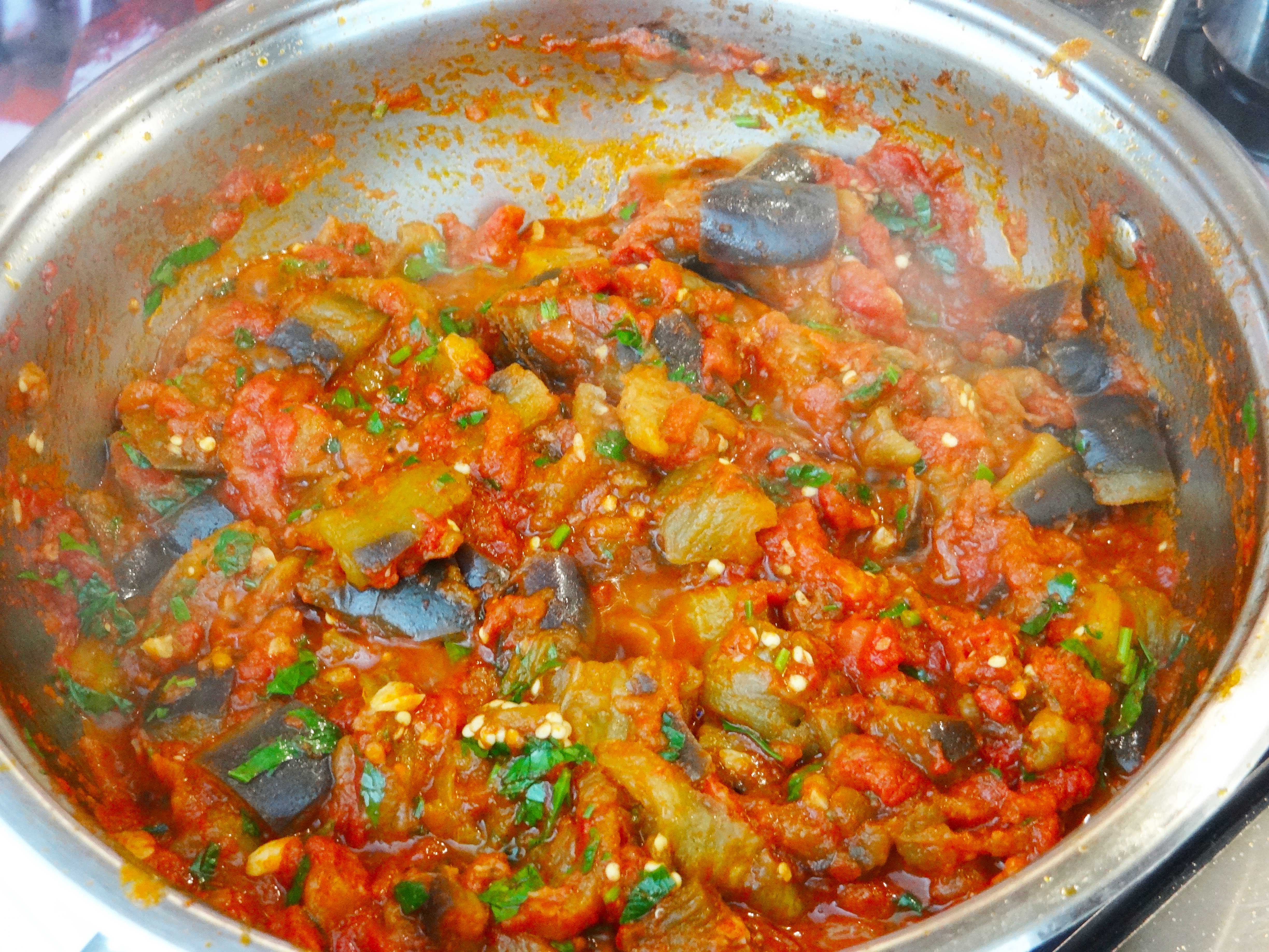 6. Peste roșii adăugăm vinetele scurse de apă și le fierbem la foc mic 8 minute. La final puneți pătrunjelul tocat mărunt.