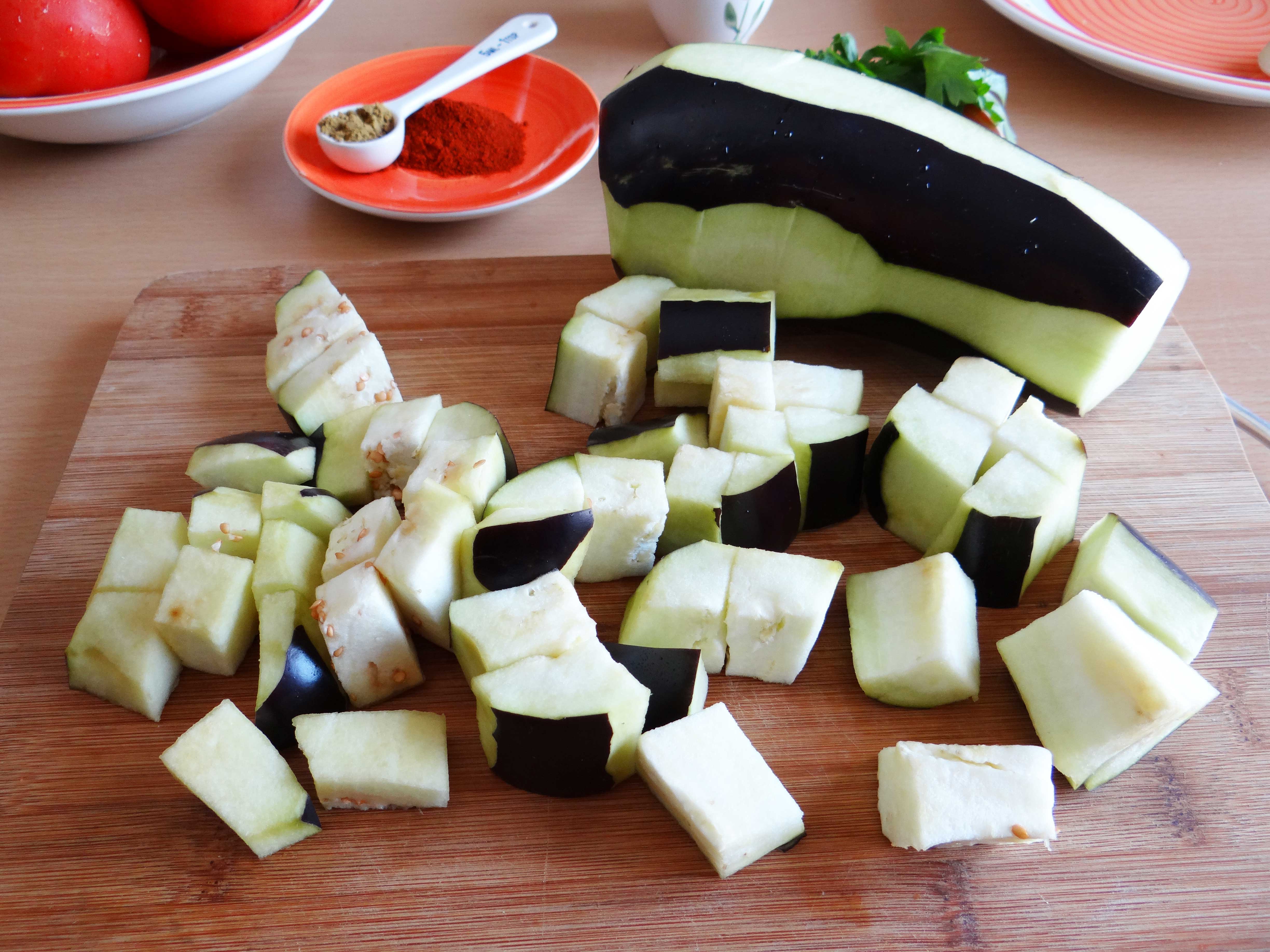 1. Curățăm vinetele parțial de coajă și le tăiem în bucăți mari.