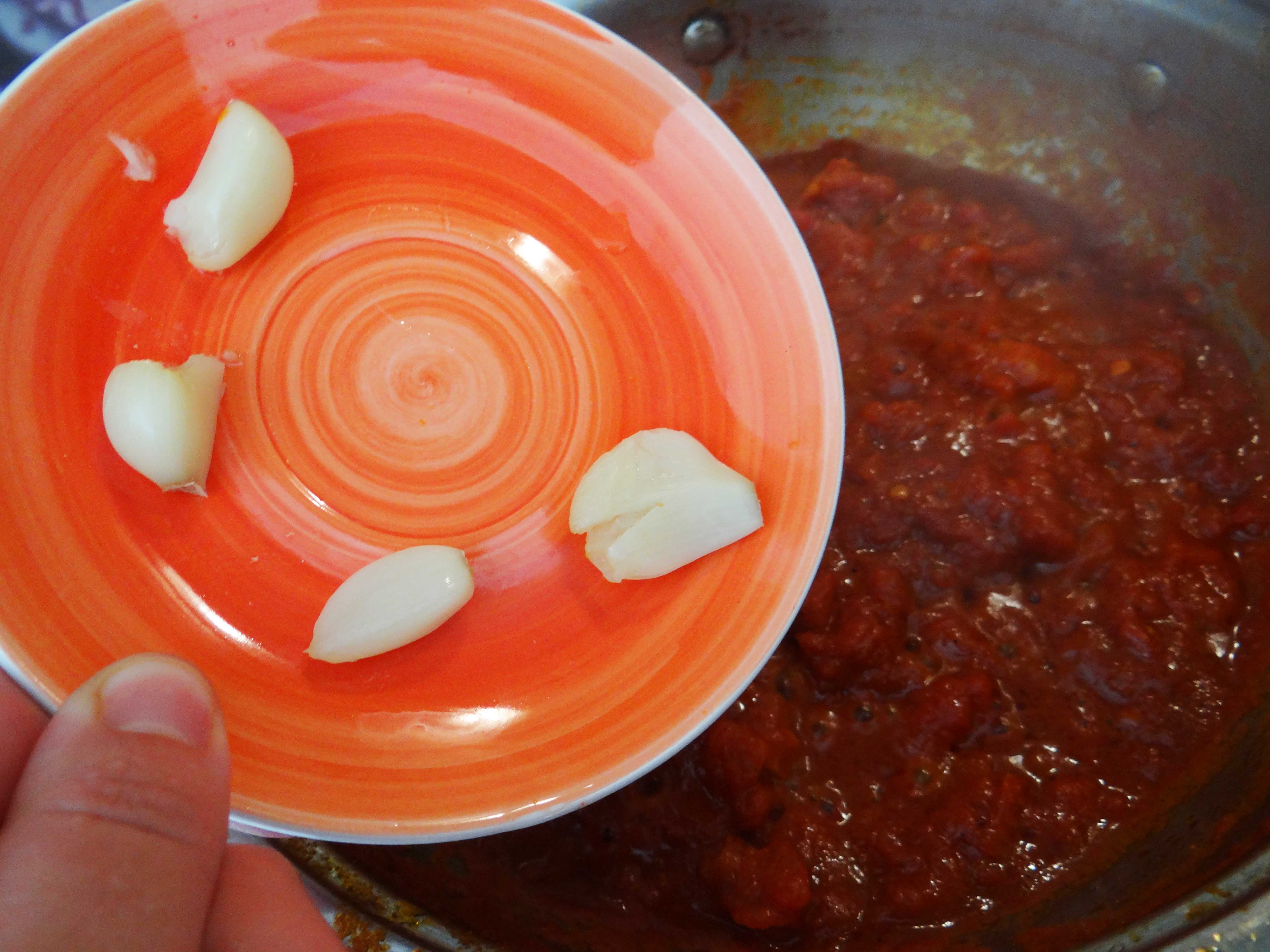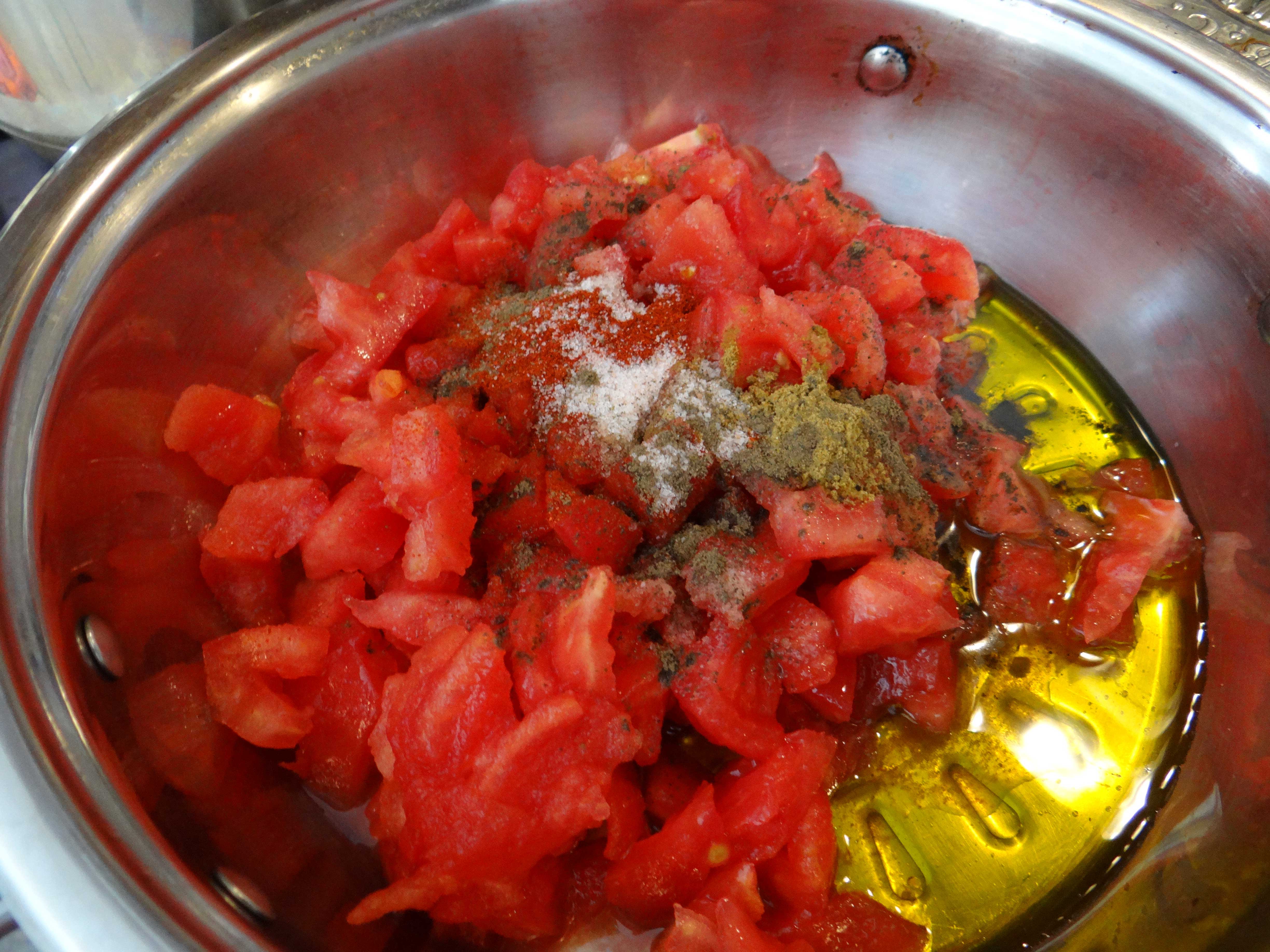 5. Punem roșiile într-o tigaie antiaderentă împreună cu uleiul, boiaua dulce, sare, piper, chimen. Le sotăm până când devin moi și apa se evaporă dupa care adăugăm usturoiul fiert și cu ajuturul unei furculițe pasăm totul. Le mai lăsăm pe foc 2 minute.