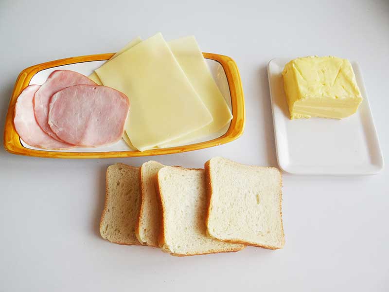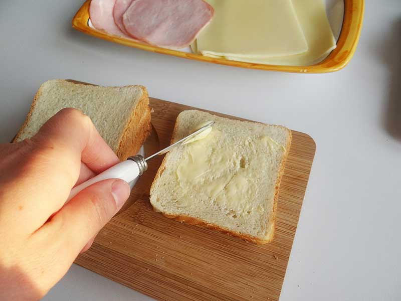 1. Ungem cu unt 2 felii de pâine. Tot acum punem o tigaie antiaderentă pe foc mediu.