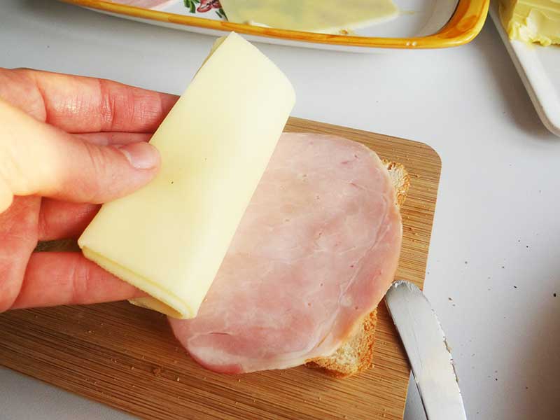 2. Pe una dintre felii punem cașcaval și șuncă(câte o felie)