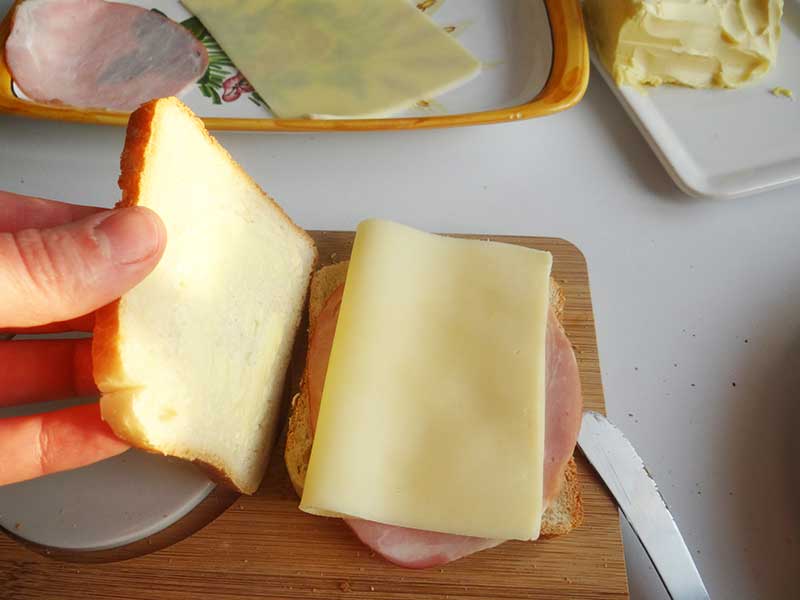 3. Peste acestea așezăm cea de-a doua felie de pâine, cu partea unsă în jos.