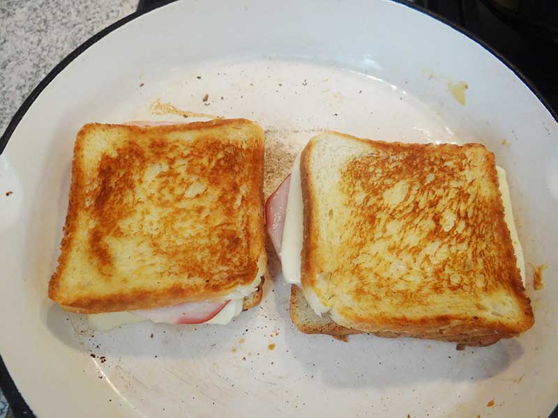 5. Prăjim sandwish-ul până devine auriu, pe abmele fețe, și cașcavalul începe să se topească.