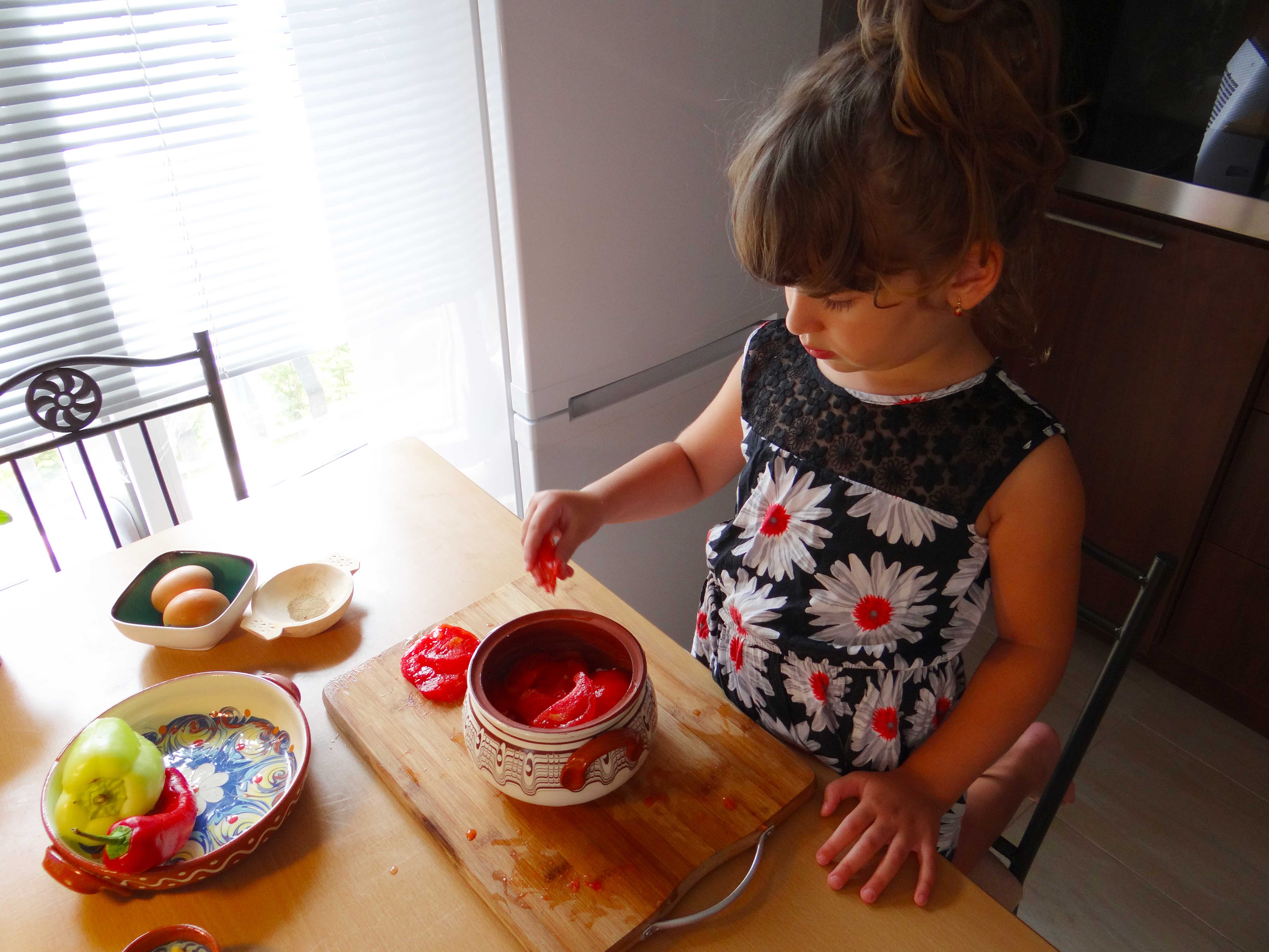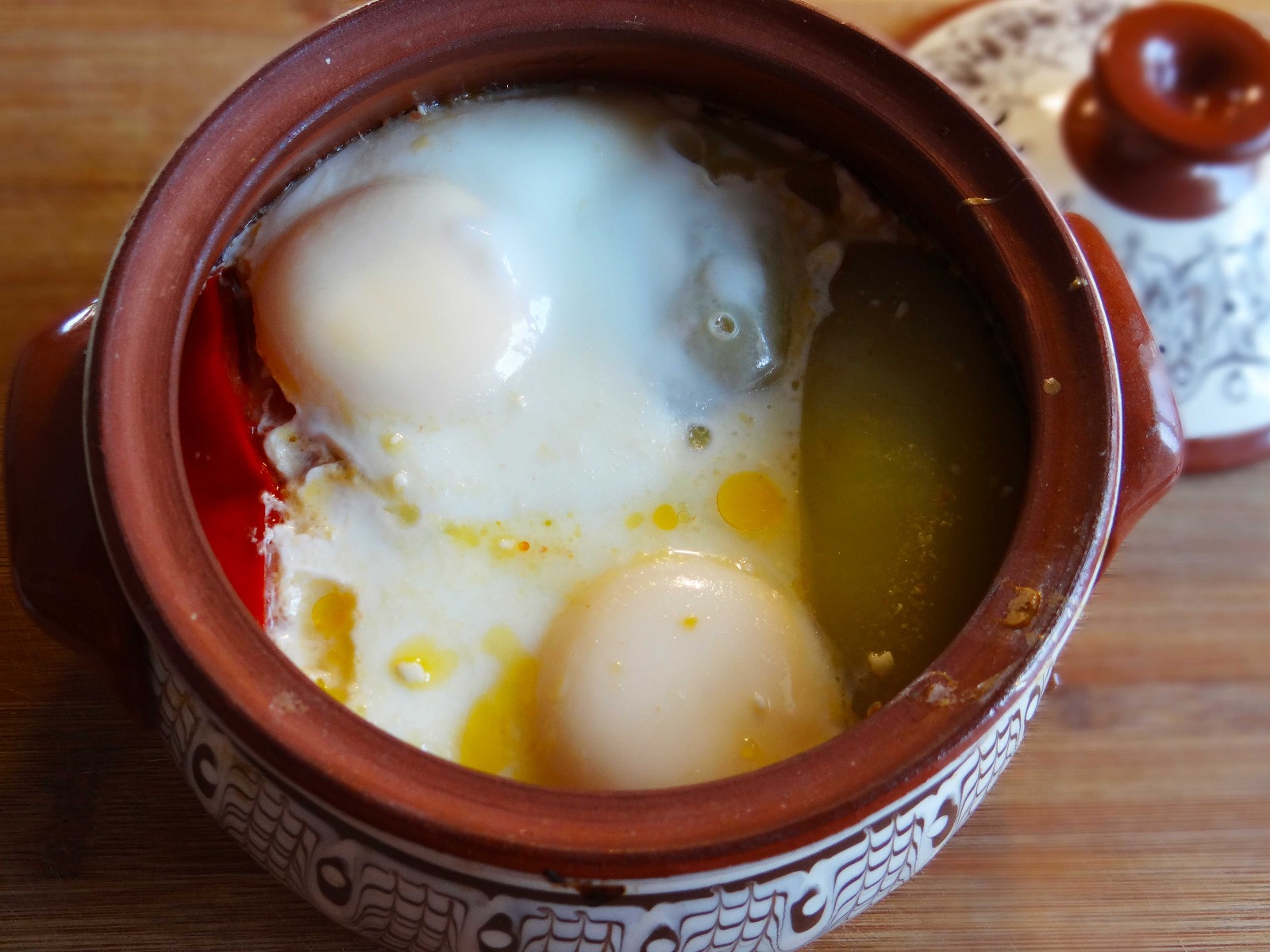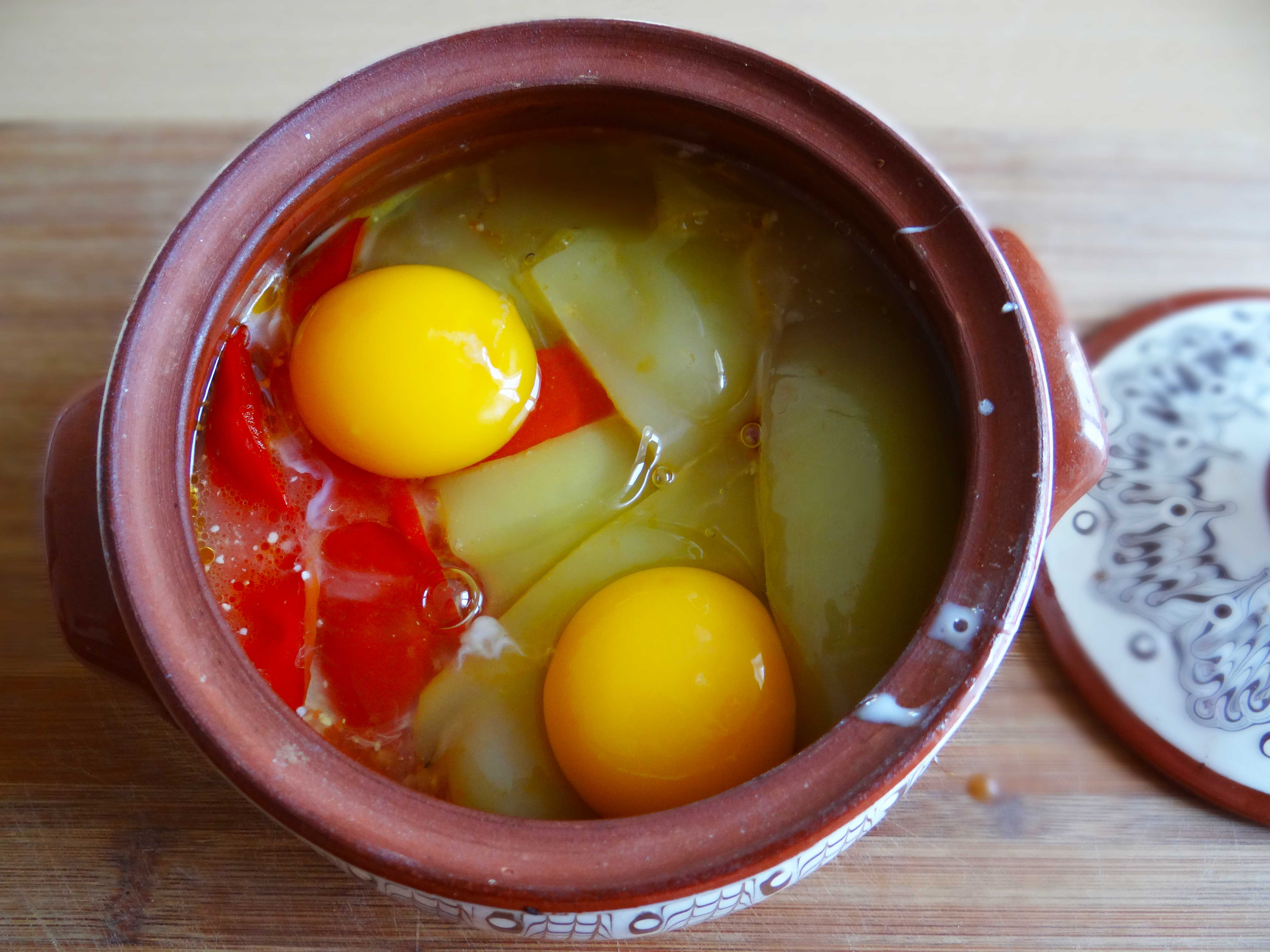 5. Dupa 50 de minute scoatem vasul din cuptor si punem deasupra ardeilor cele doua oua si piper dupa gust.