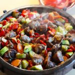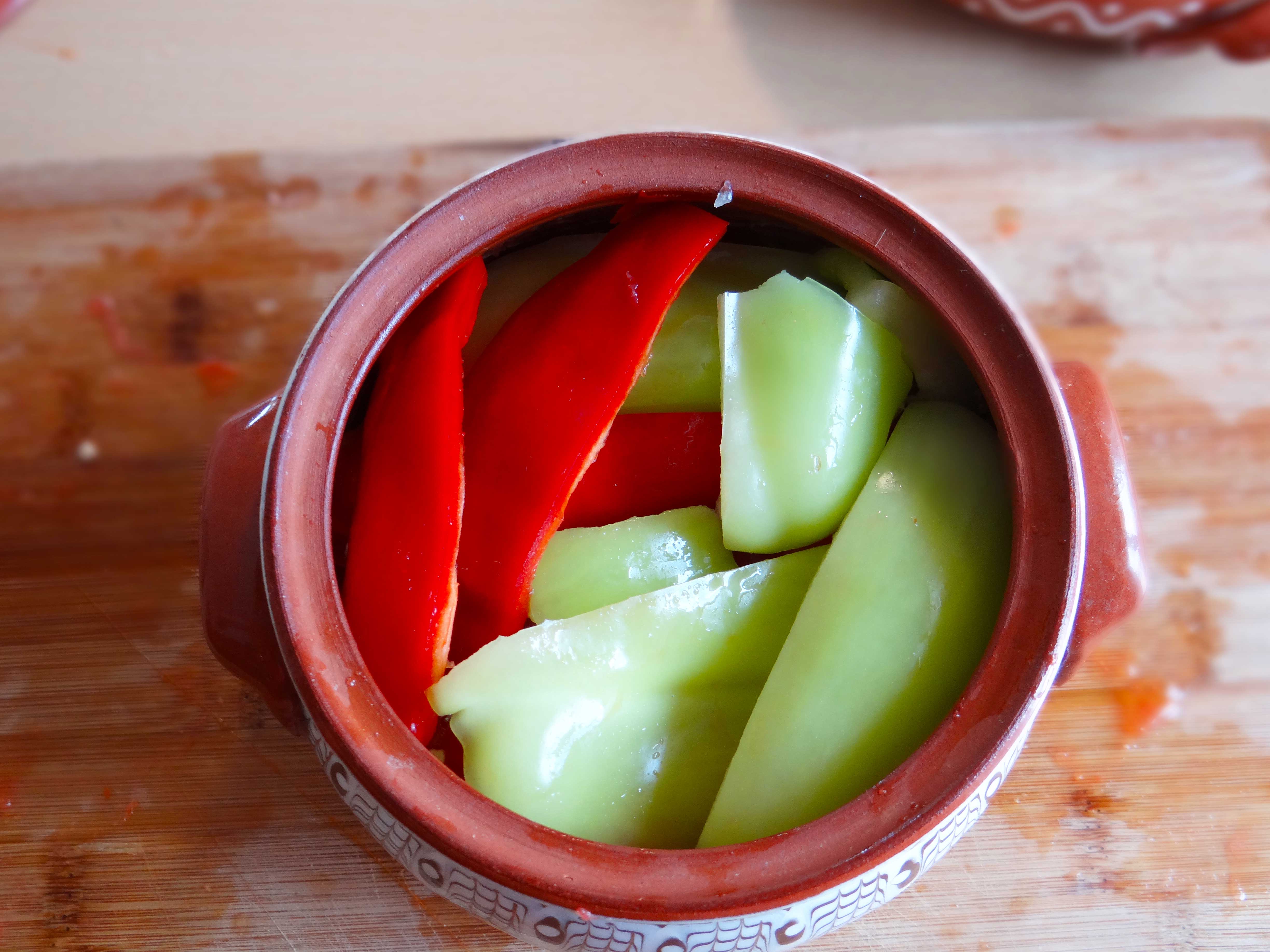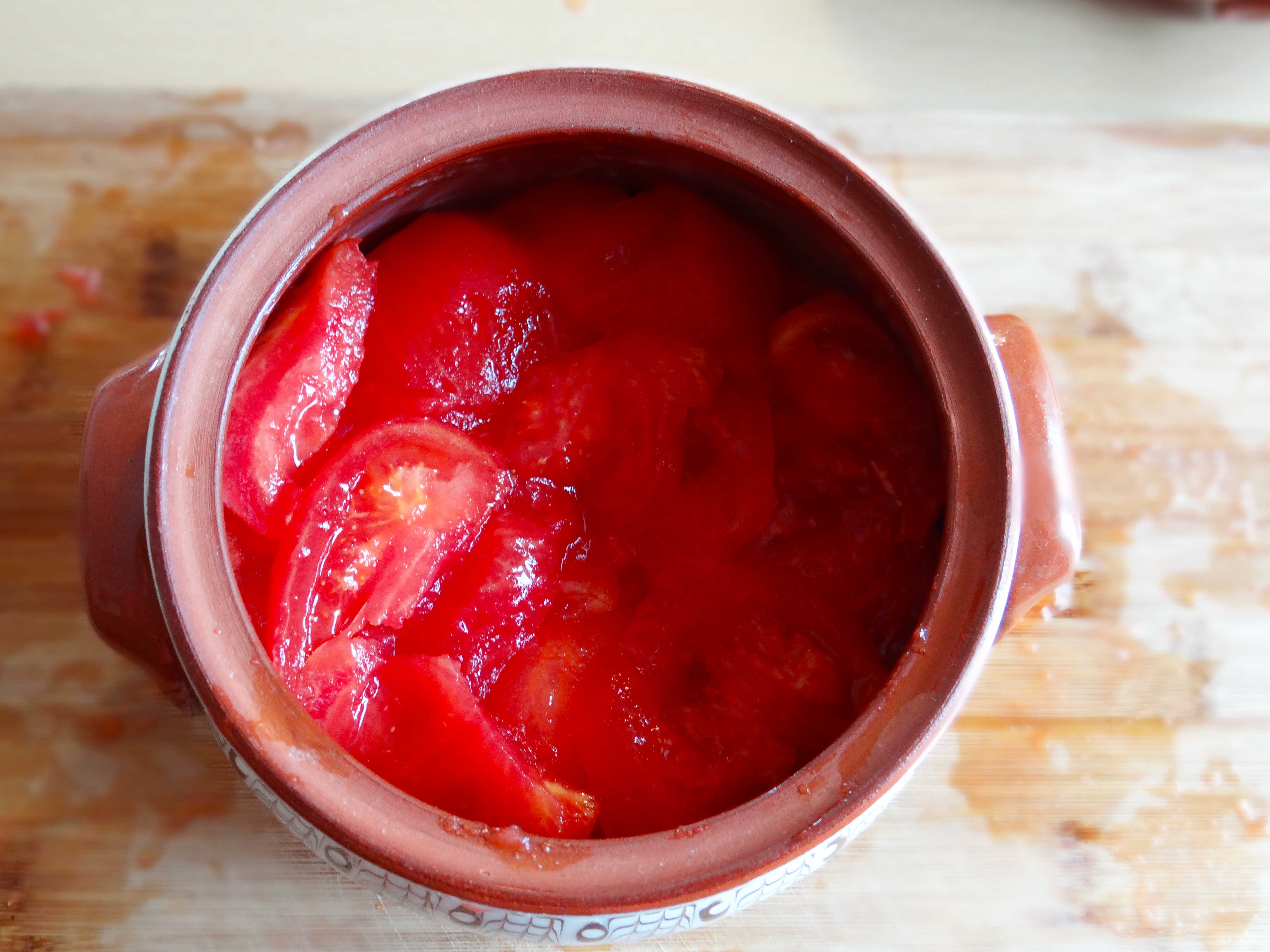 4. Taiem ardeii in bucati mari si apoi ii asezam peste rosii. Punem capacul deasupra vasului de pamant si il dam la cuptor la 180°C pentru 50 de minte. Atentie cuptorul nu se preincalzeste. Ca regula generala atunci cand gatiti in vase de pamant trebuie sa evitati schimbarile bruste de temperatra.