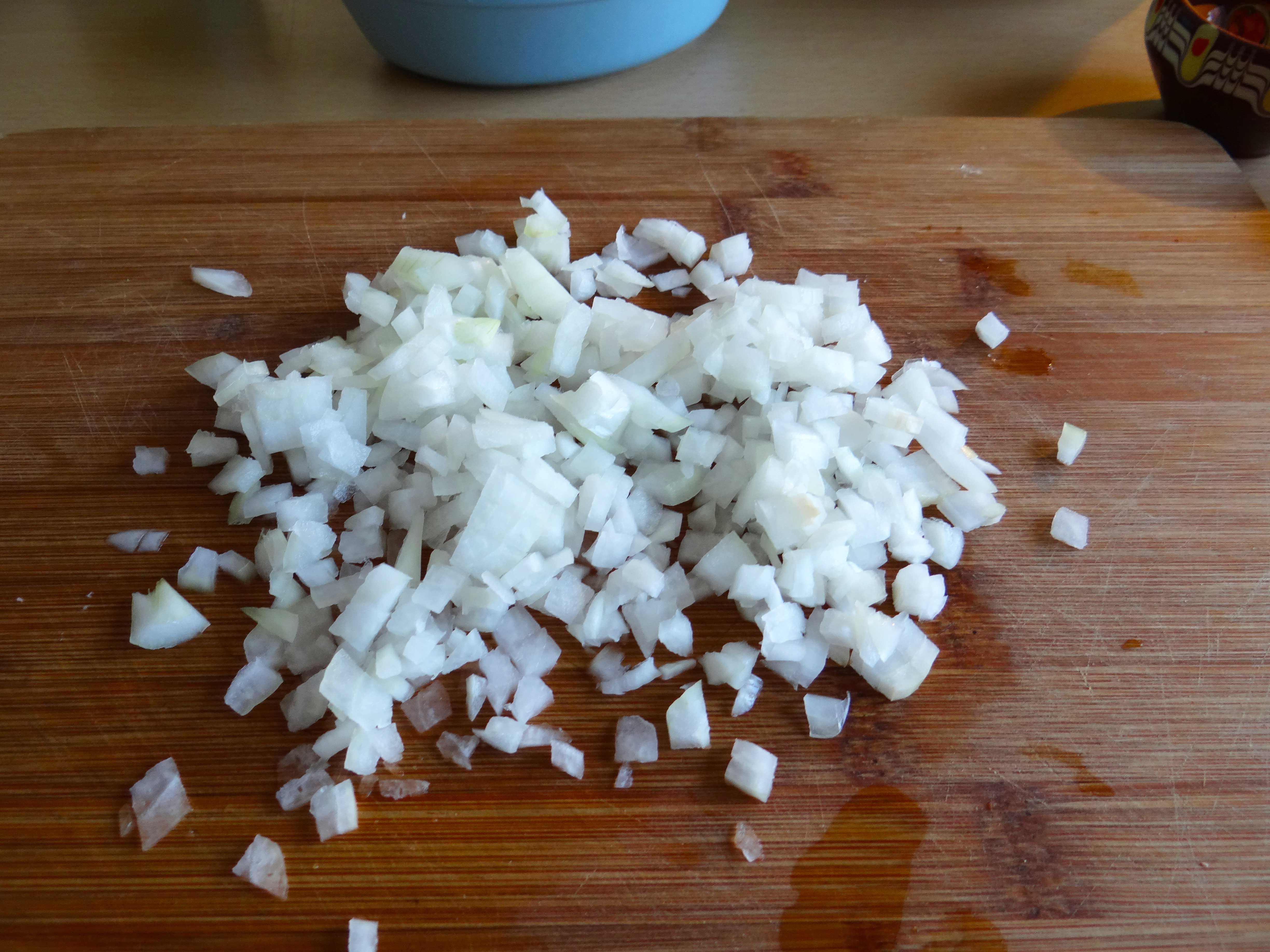 1. Curățăm și tăiem ceapa cât putem noi de mic.