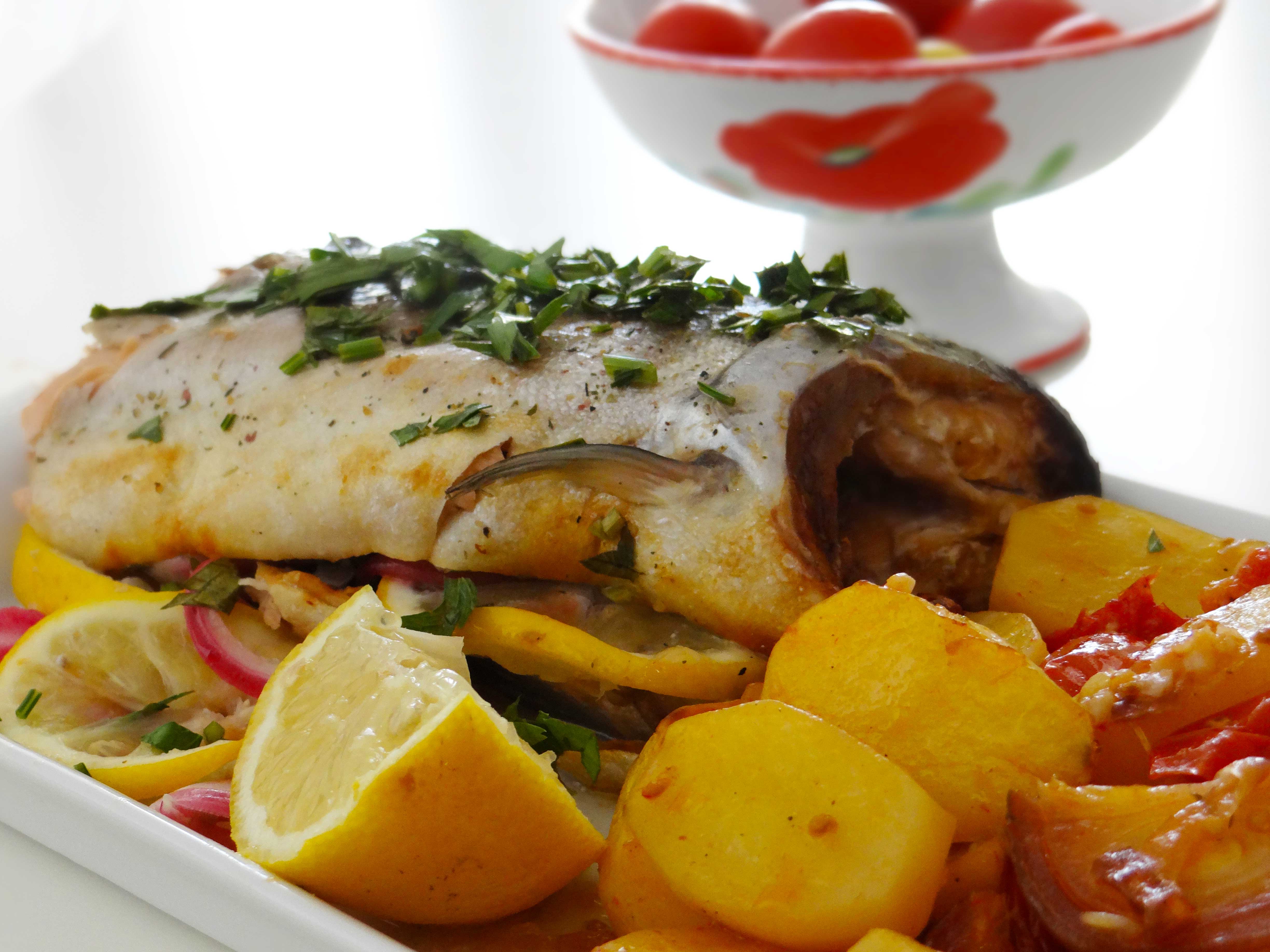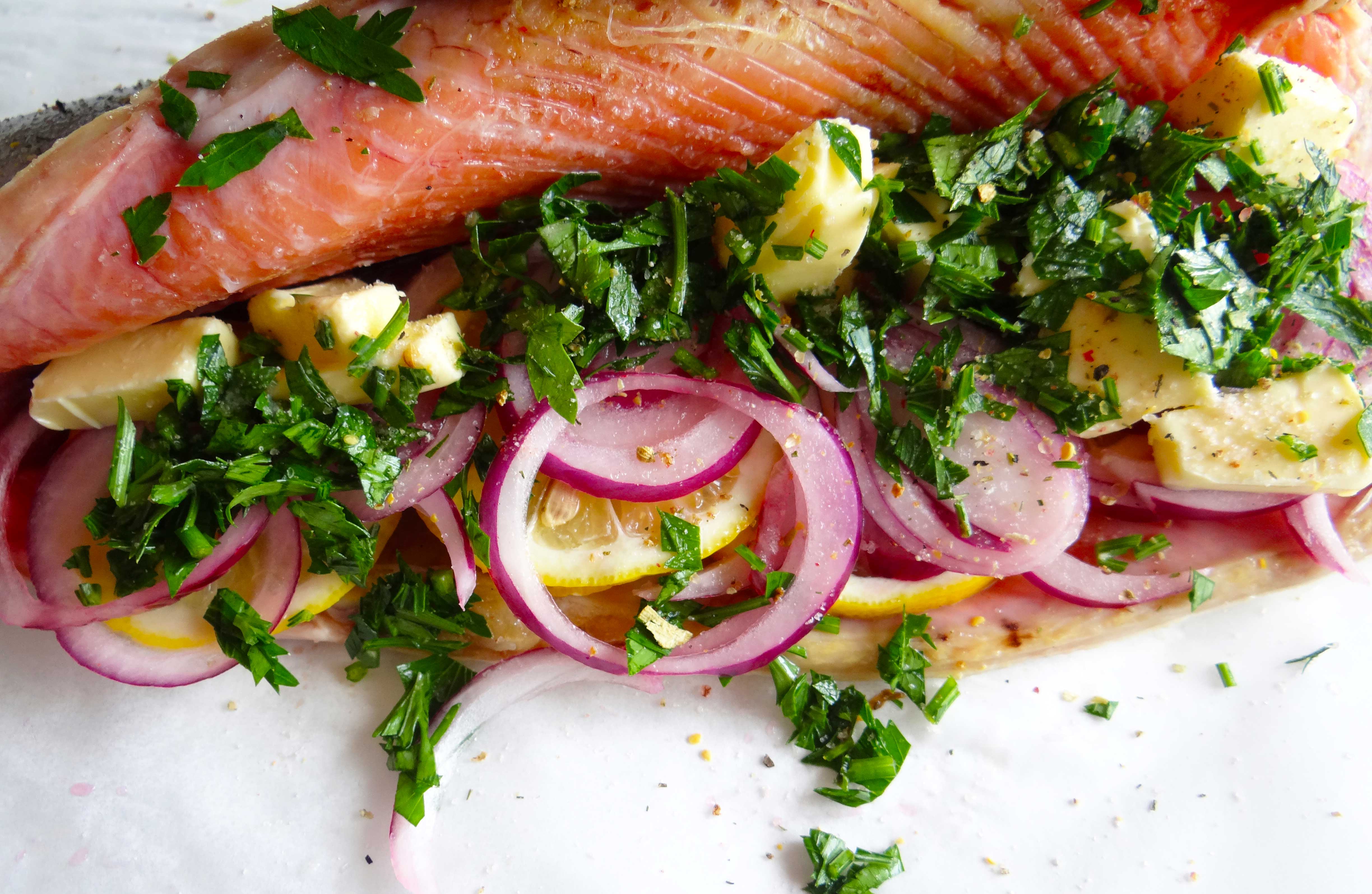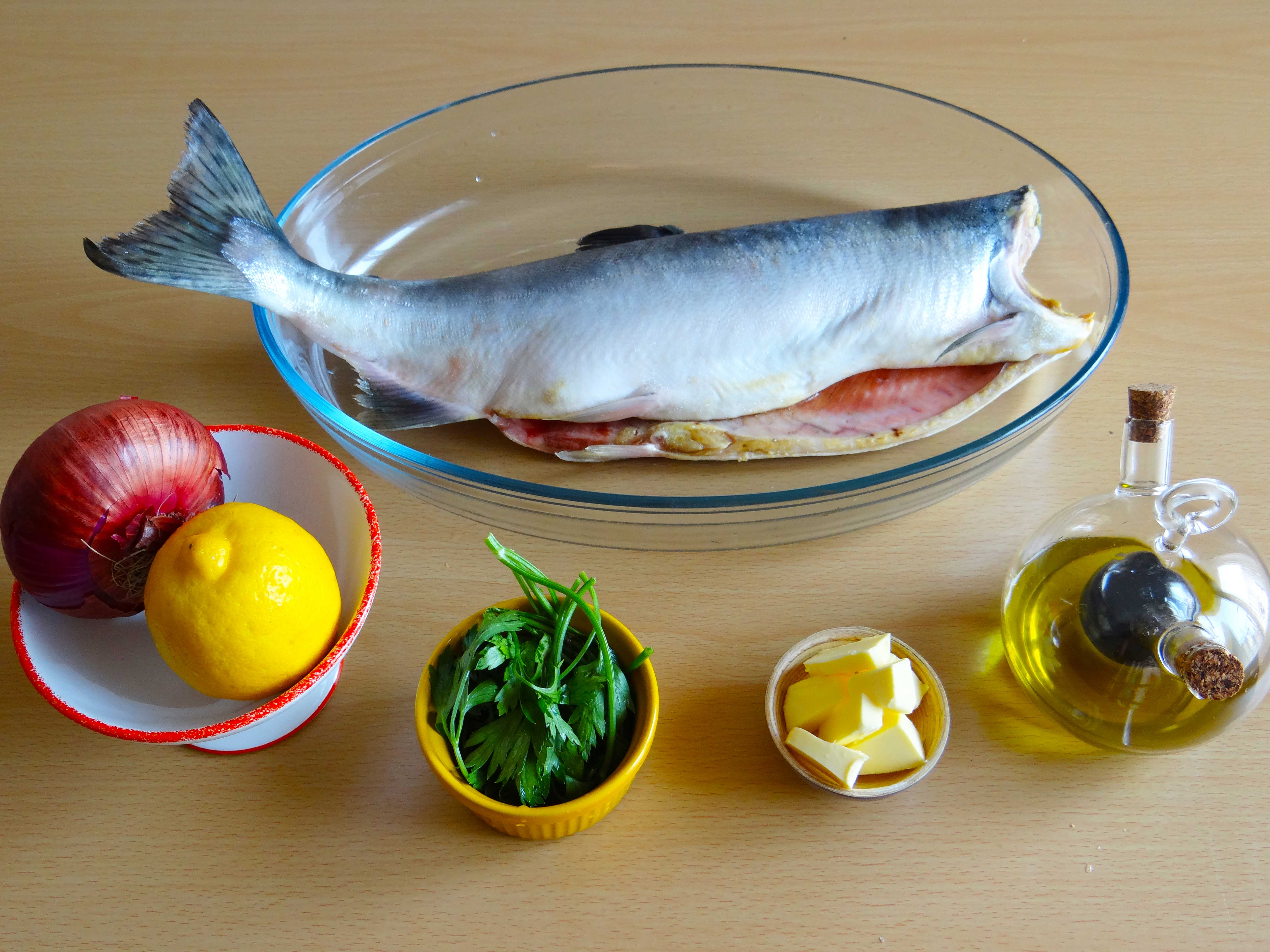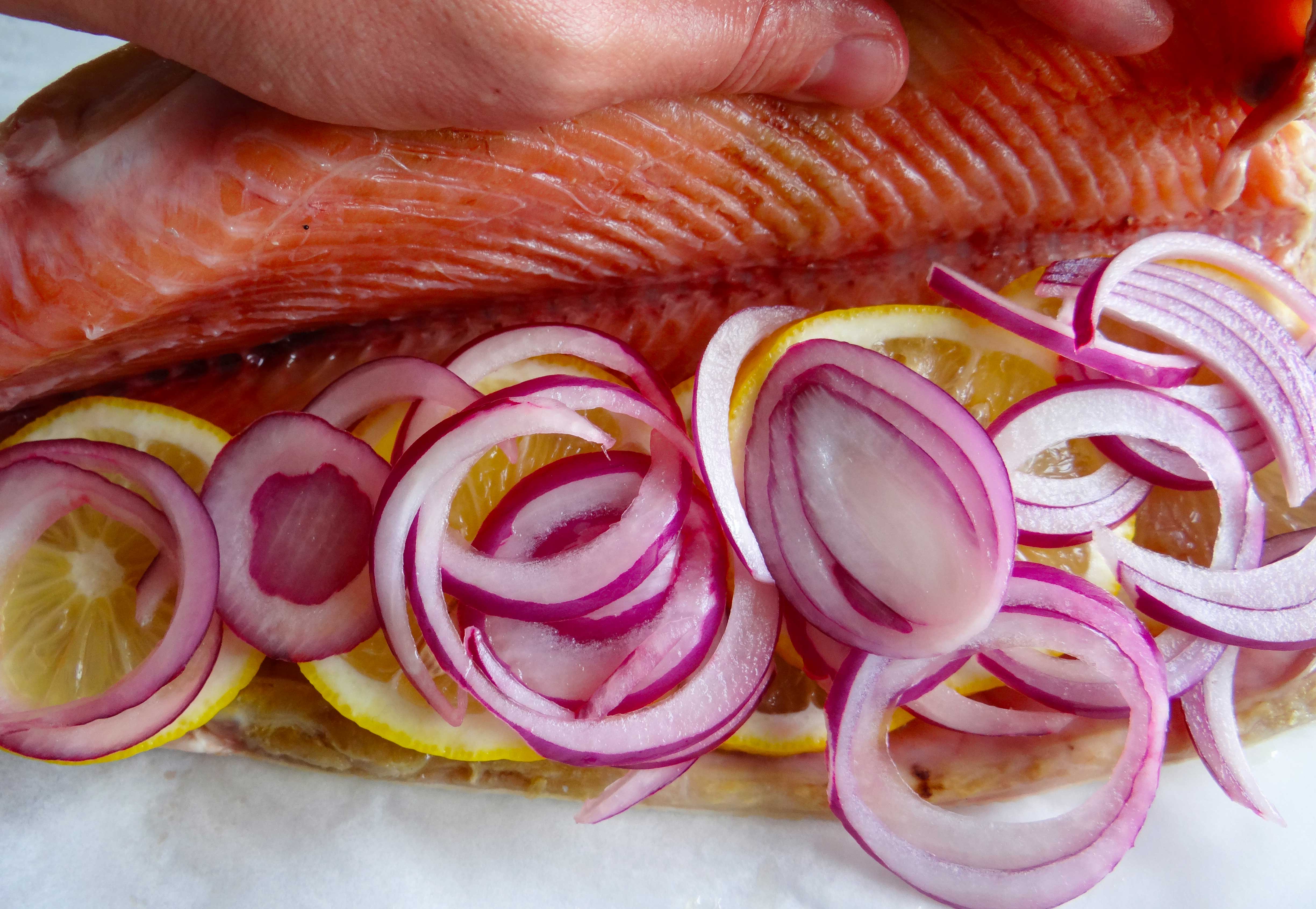 5. Sărăm și piperăm peștele la exterior și apoi îl umplem cu feliile de lămâie, inelele de ceapă și cu pătrunjelul tocat mărunt. Adaugăm și cuburile de unt deasupra feliilor de lămâie. Sărăm și piperăm și în interior.