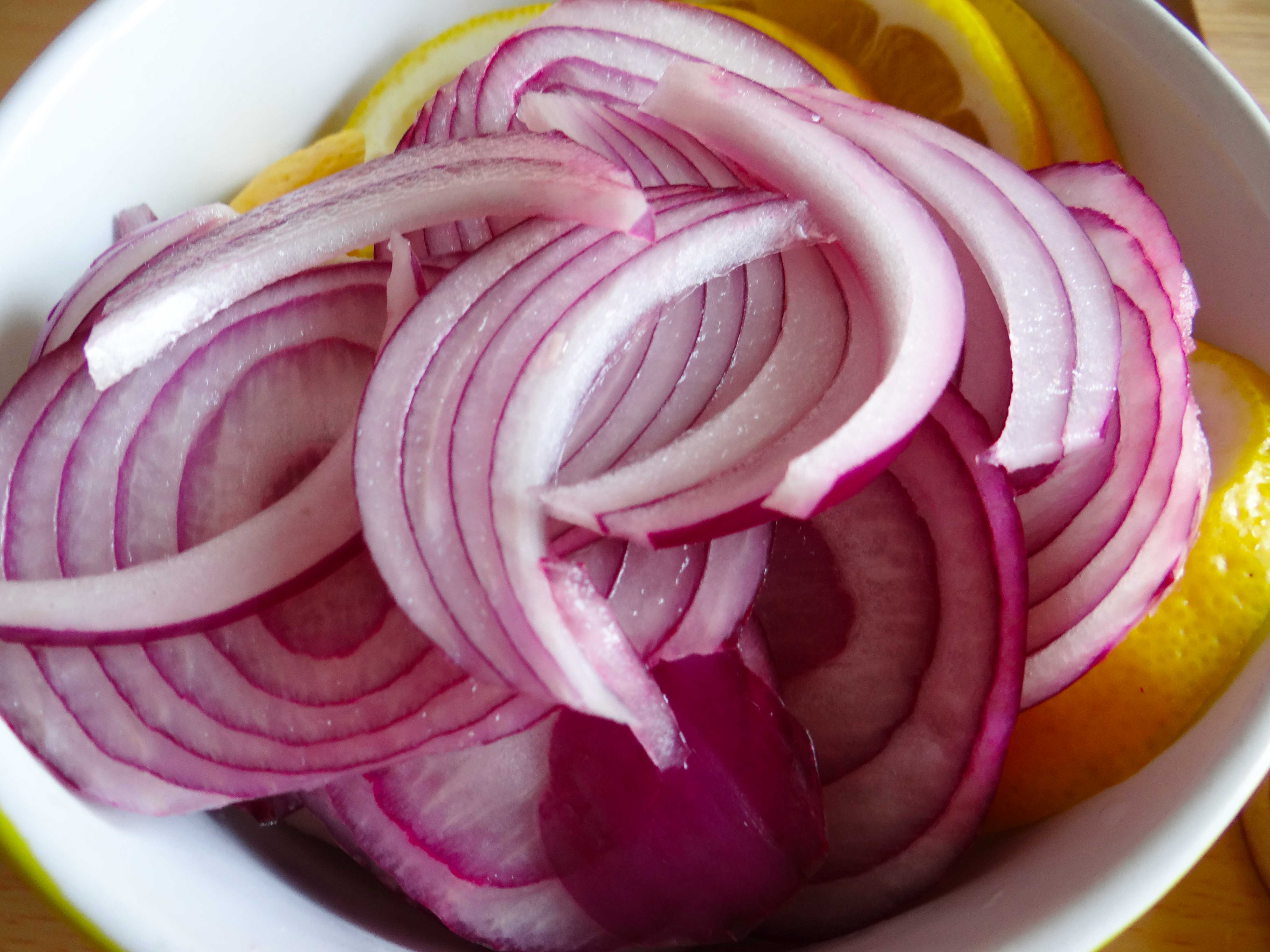 3. Tăiem lămâia și ceapa în felii. Tocăm pătrunjelul.