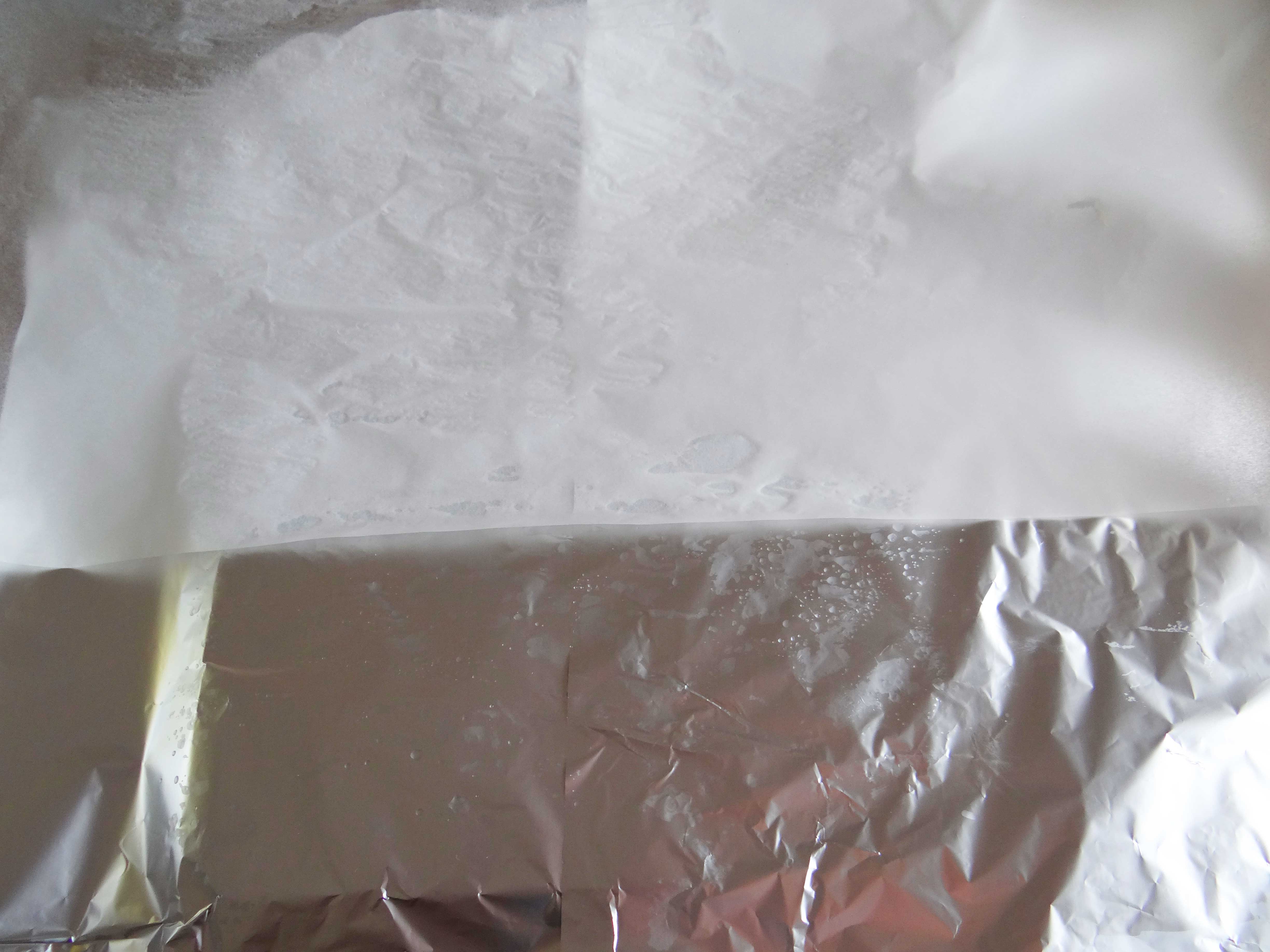 4. Punem o bucată de folie de aluminiu pe masa de lucru, peste ea punem o bucată de hârtie de copt. Așezăm peștele deasupra și apoi îl ungem bine cu ulei.